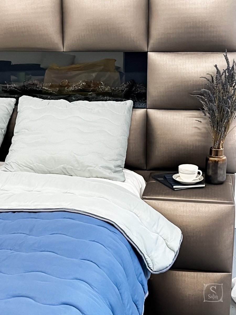 - Одеяло Grey Infinity в серо-голубых тонах с чехлом из микрофибры не вызывает аллергических реакций, дарит комфортный сон и очень легкое в уходе.