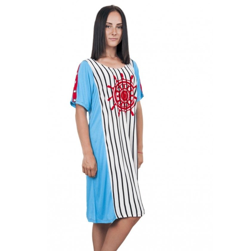 Женская туника Sccalla 2114 представлена в разноцветных тонах с рисунком морской штурвал и полоска, со вставкой голубого цвета.