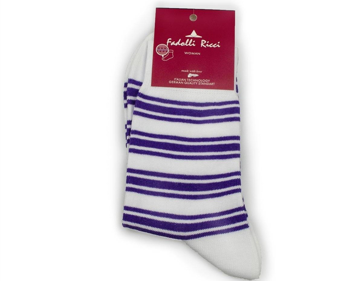 Носки женские бело-фиолетовые (0019UZ-3B) с большим содержанием 76% длиноволокнистого хлопка с добавлением 20%,полиамида и 4%, эластана. Такой состав позволяет сохранить хороший внешний вид носка и увеличить срок эксплуатации. Мысок обработан плоским швом (кетельным швом), что позволяет при носке не испытывать дискомфорта. Носки классической длины.