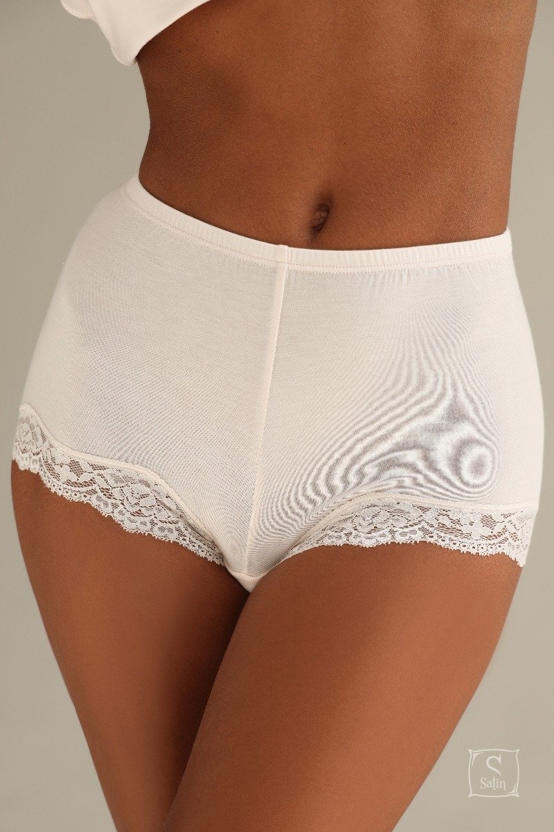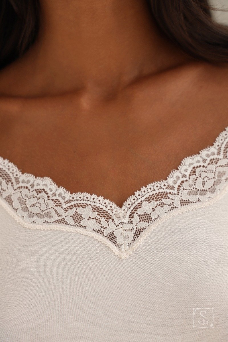 Комплект для сна женский German Volf 24095 майка и мини шорты с кружевом кремового цвета из гладкой трикотажной модаловой ткани. Модал – экологически чистый материал нового поколения, изготовленный из целлюлозных волокон бука. Он известен своей мягкостью, воздухопроницаемостью и долговечностью, что делает его отличным выбором для одежды и белья. Одежду с модала можно стирать и сушить в машине, поэтому она удобна и проста в уходе.
