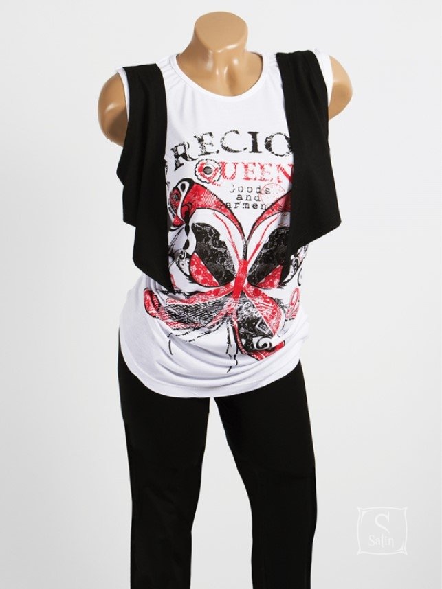 Домашний женский комплект Sccalla 2305 включает футболку в черно-бело-красных тонах с рисунком и надписью, и бриджи черного цвета. Модель со стильным и комфортным дизайном, практична и удобна.