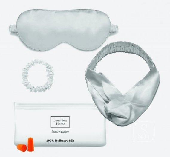 В набор входят: маска, беруши, обруч, резинка для волос и пластиковая косметичка. Маска для сна и обруч Love you серого цвета изготовлена из 100% шелка.