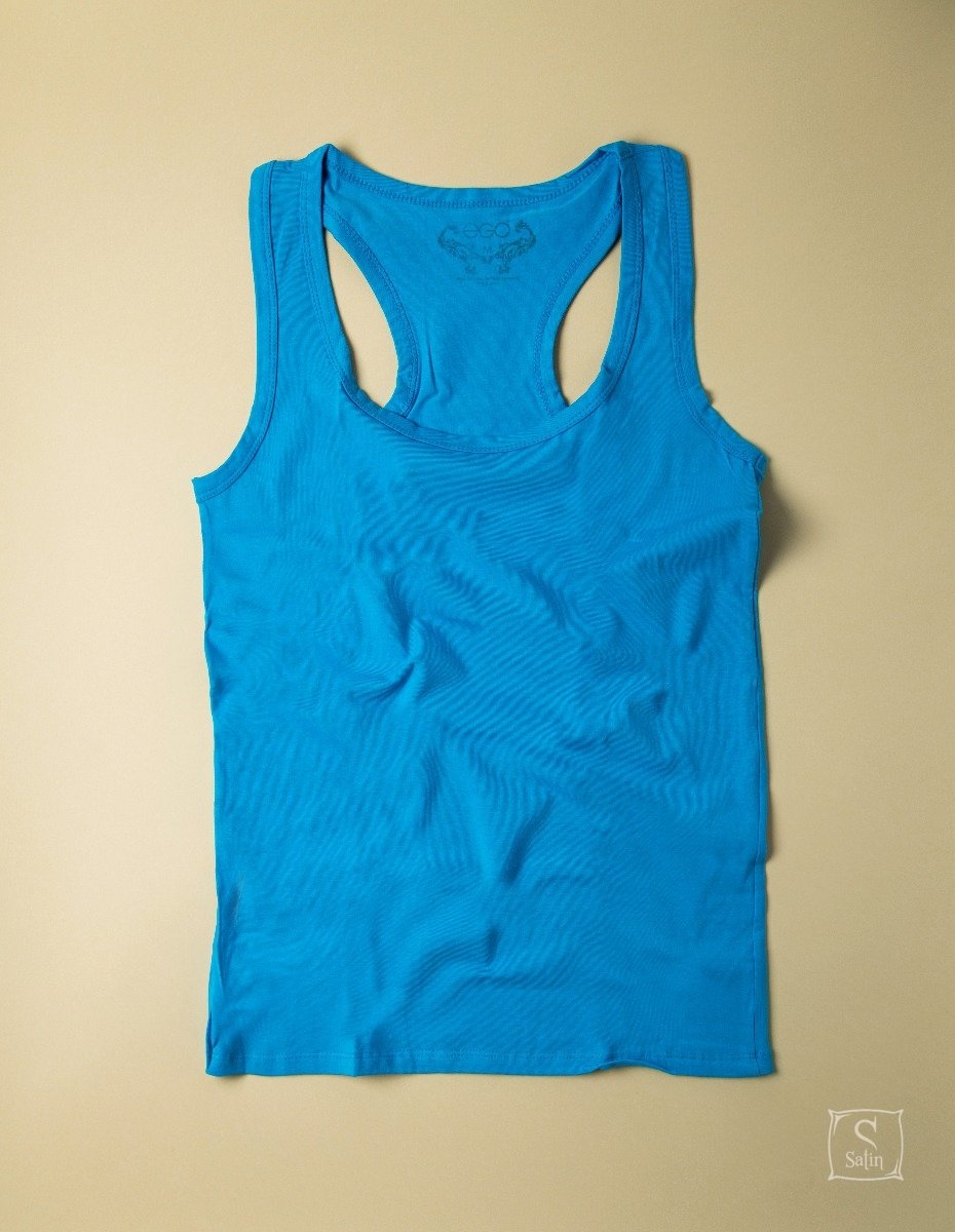 Майка женская приталенного силуэта на широких брителях с углублениями на спине в районе лопаток.