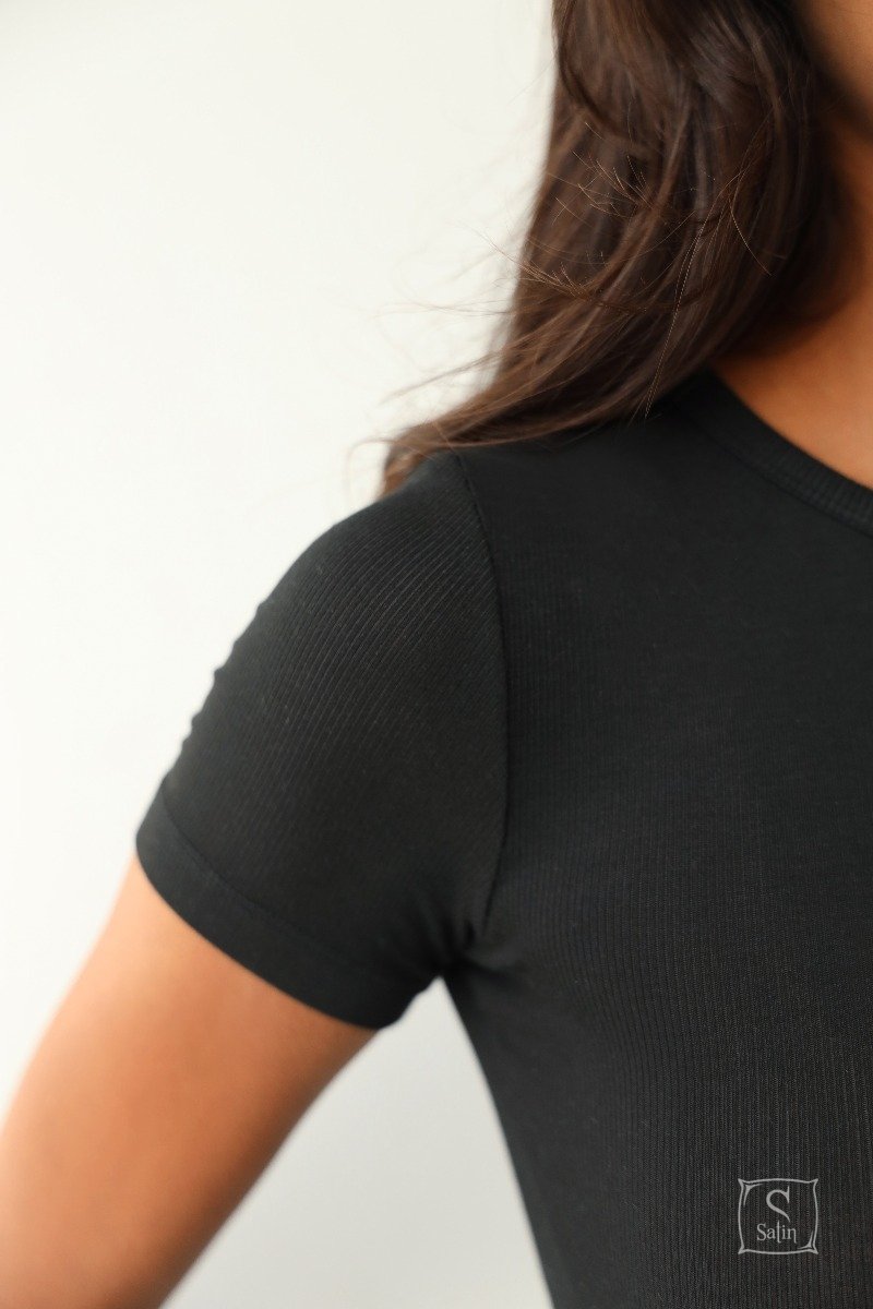 Футболка женская из модаловой ткани в мелкий рубчик German Volf 24102 черного цвета. Модал – экологически чистый материал нового поколения, изготовленный из целлюлозных волокон бука. Он известен своей мягкостью, воздухопроницаемостью и долговечностью, что делает его отличным выбором для одежды и белья. Вещи с модала можно стирать и сушить в машине, поэтому они удобны и просты в уходе.