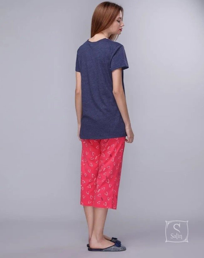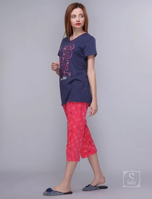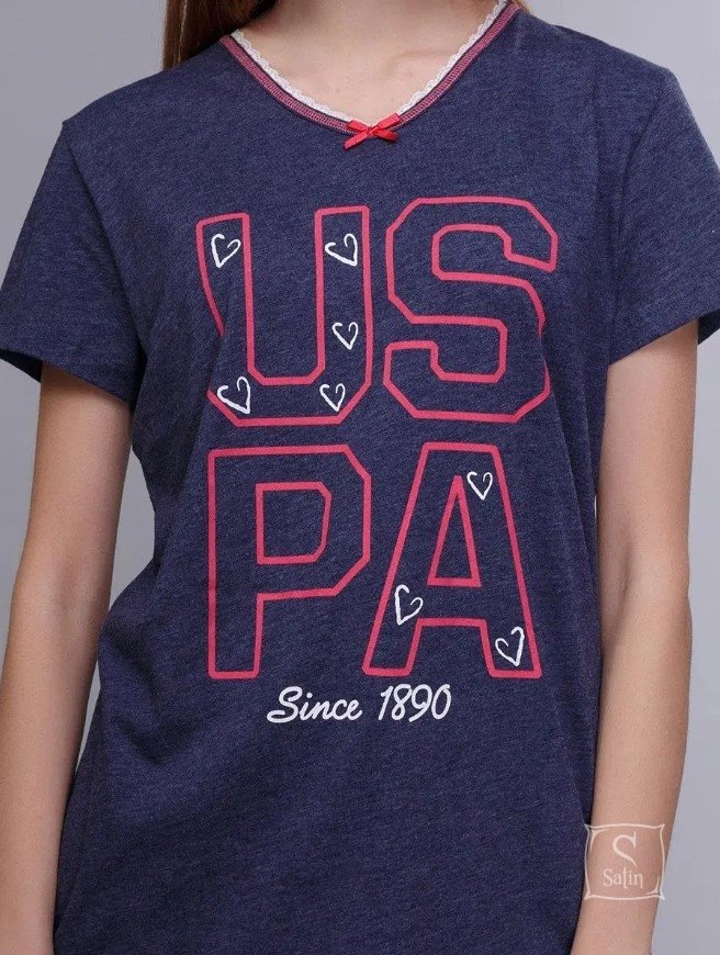 Домашний женский комплект U.S. Polo Assn 15662 включает футболку синего цвета с надписью и бриджи с узором сердечки. Модель со стильным и комфортным дизайном, практична и удобна.