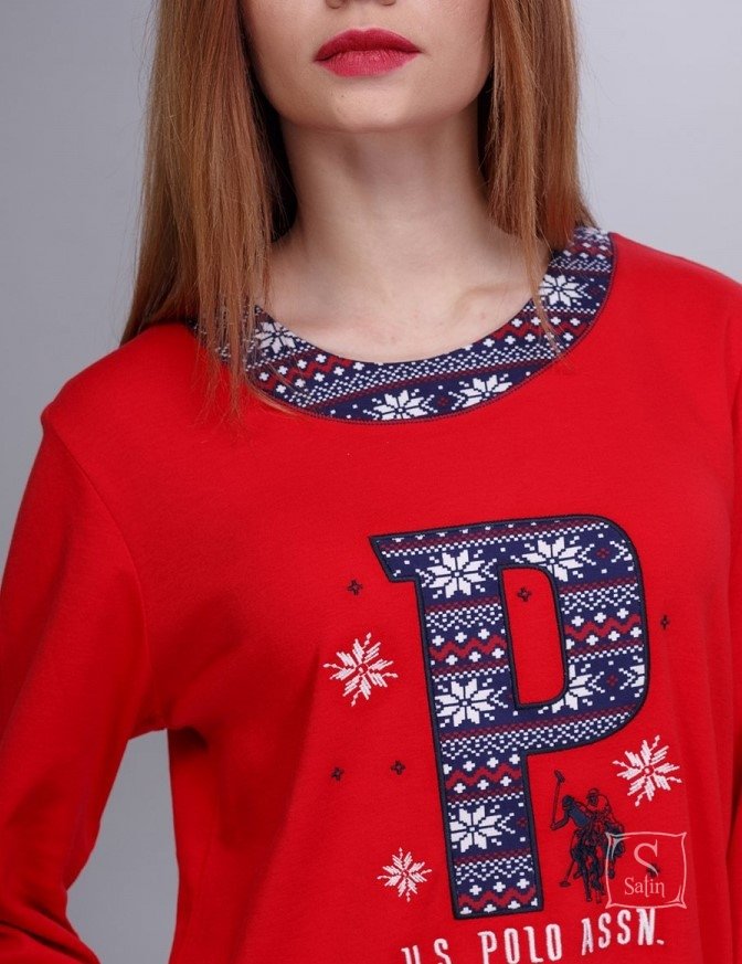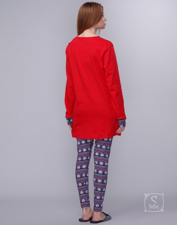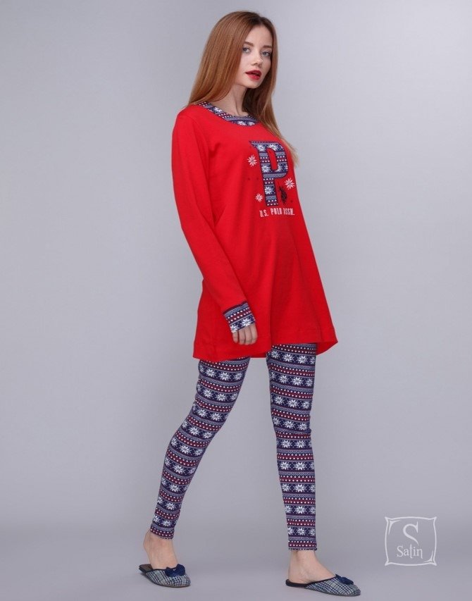 Пижама женскаят U.S. Polo Assn 15662 включает футболку с длинным рукавом и лосины в красно-синих тонах с геометрическим зимним узором. Модель со стильным и комфортным дизайном.