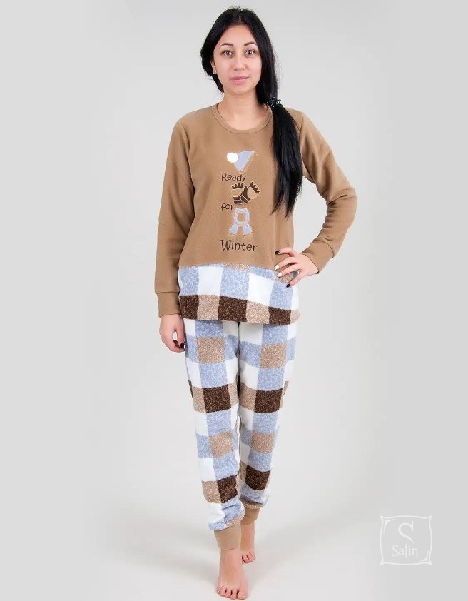 Женская пижама Dika 4624 выполнена в бежево-разноцветных тонах. Состоит из кофты с изображением зимних атрибутов (перчаток, шапки и шарфа) и брюк с принтом в клетку.