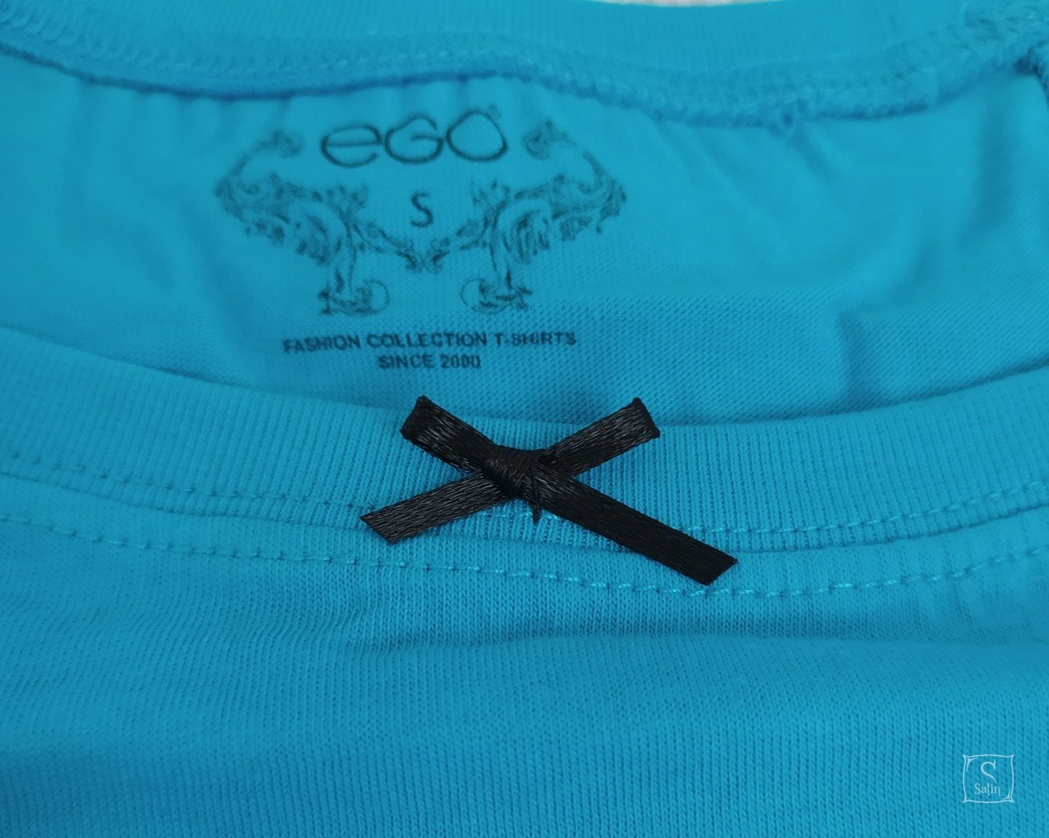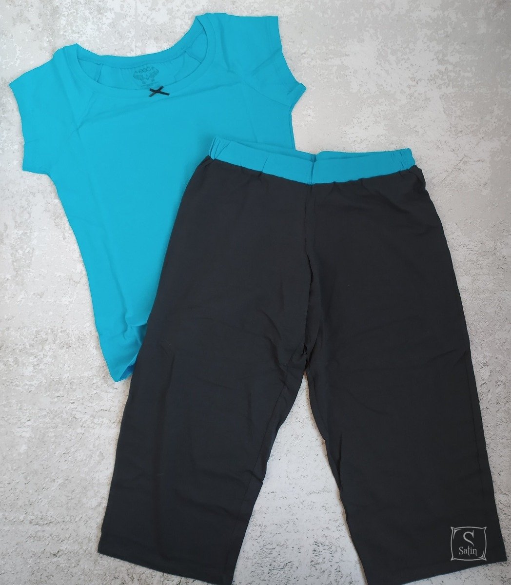 Пижама женская EGO P 07 состоит из футболки с коротким рукавом и бриджей. Футболка в стиле реглан бирюзового цвета, бриджи - черные. Изготовлена из хлопкового трикотажа. Является прекрасной удобной и нарядной одеждой для дома и сна.