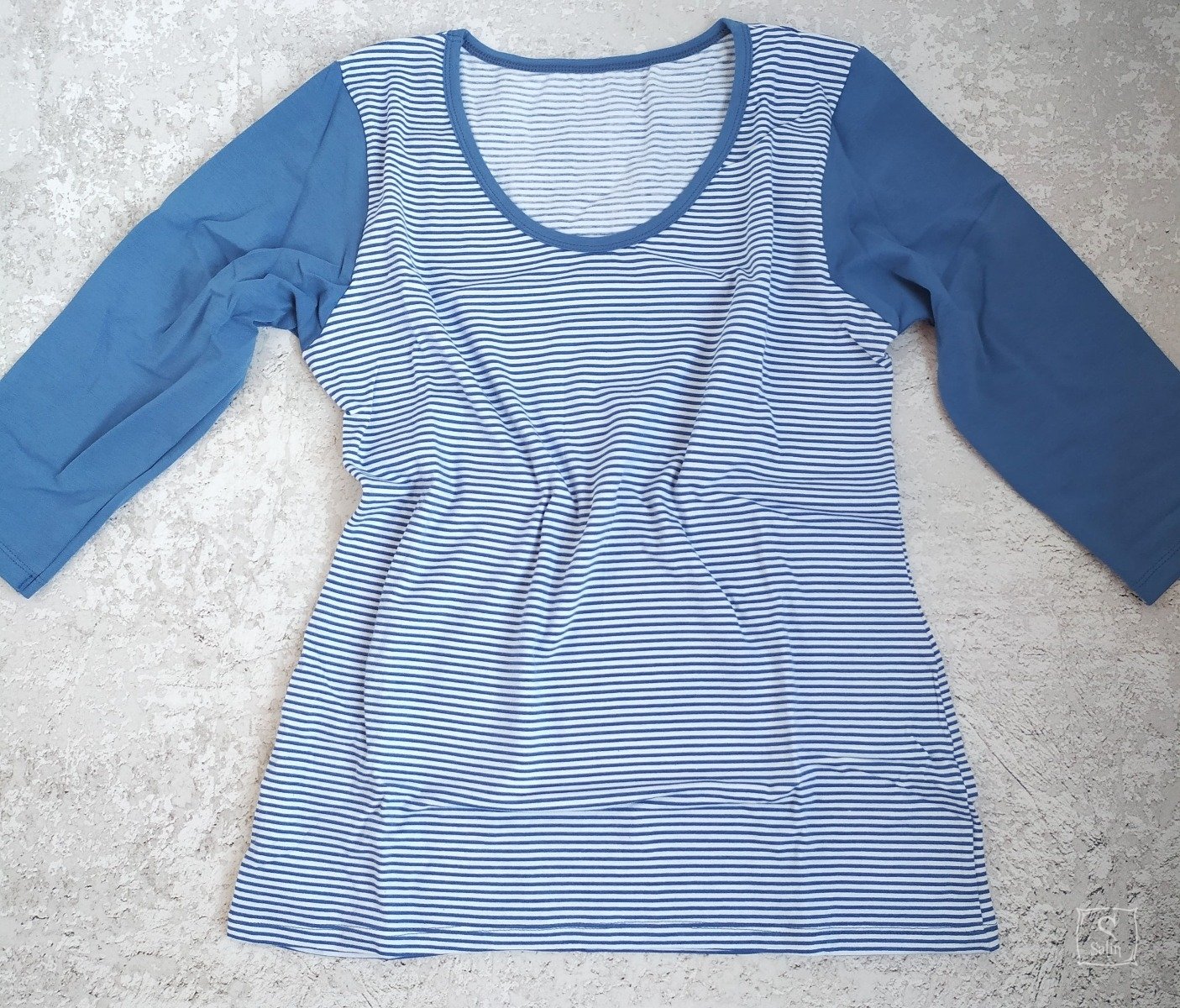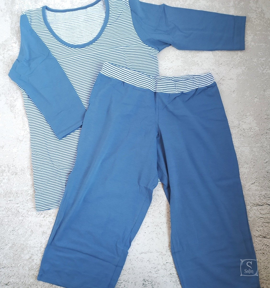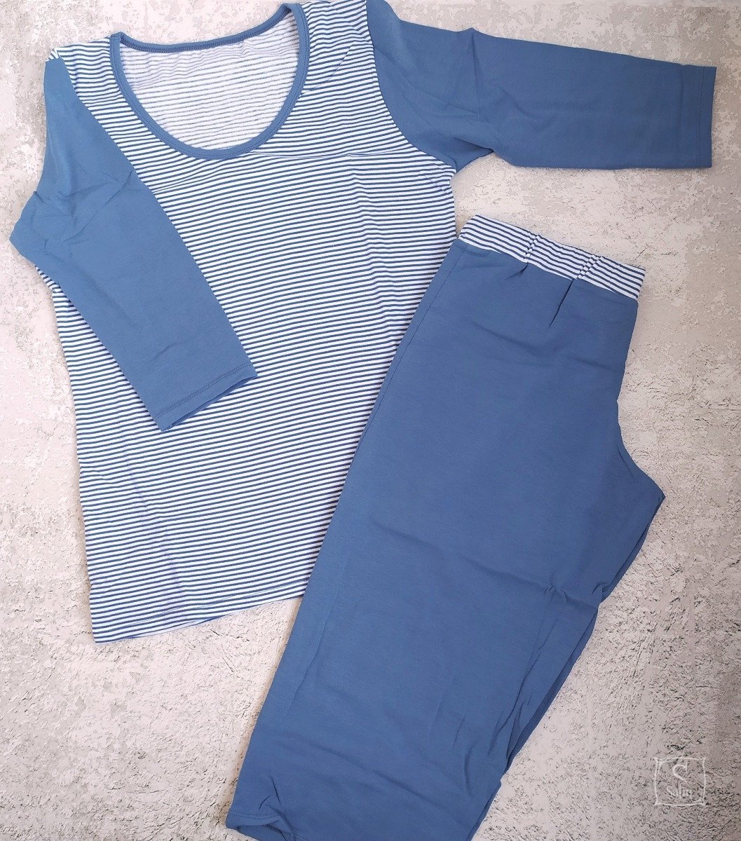 Пижама женская EGO PК 01 состоит из футболки с рукавом 3/4 и бриджей. Футболка в стиле реглан, комбинированная (белая полоска+синий меланж), бриджи - синий меланж. Изготовлена из хлопкового трикотажа. Является прекрасной удобной и нарядной одеждой для дома и сна.