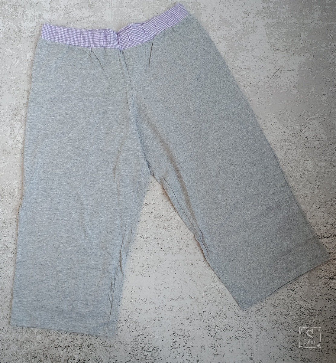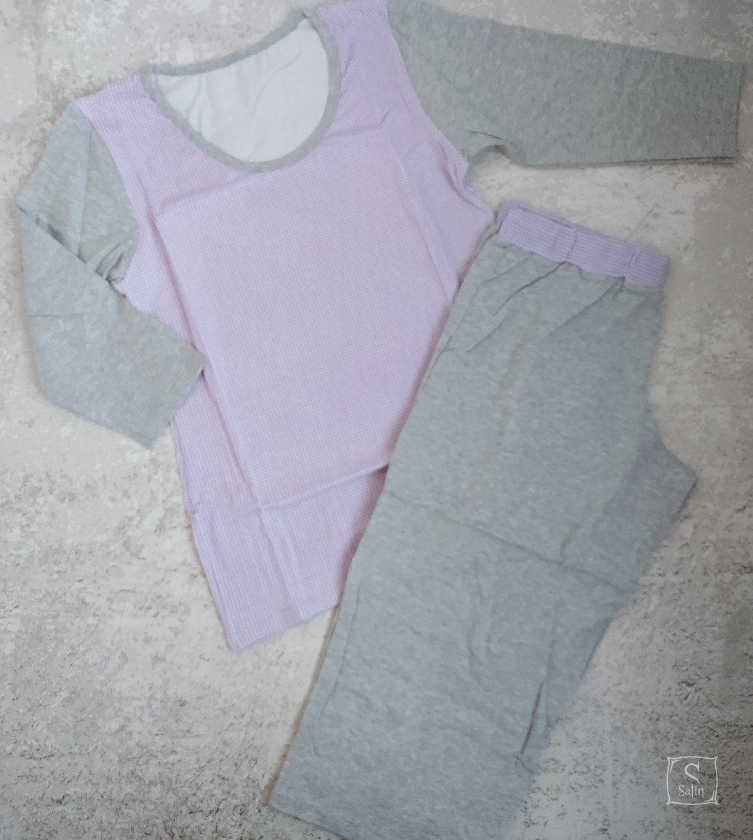 Пижама женская EGO PК 08 состоит из футболки с рукавом 3/4 и бриджей. Футболка в стиле реглан, комбинированная (фиолетовая клетка+серый меланж), бриджи - серый меланж. Изготовлена из хлопкового трикотажа. Является прекрасной удобной и нарядной одеждой для дома и сна.