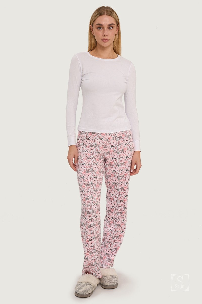 Лонгслив выполнен в минималистическом дизайне с длинными рукавами и округлым вырезом горловины, что придает элегантную простоту и удобство. Благодаря свободному крою, лонгслив не ограничивает движений, обеспечивая комфорт и свободу во время сна или отдыха дома. Белый цвет придает образу свежести и чистоты, а также отлично сочетается с цветочным узором на брюках, создавая нежный и женственный вид.