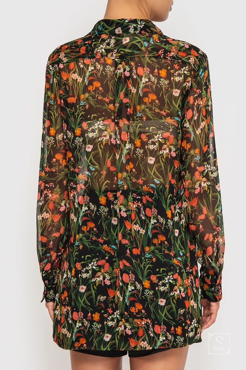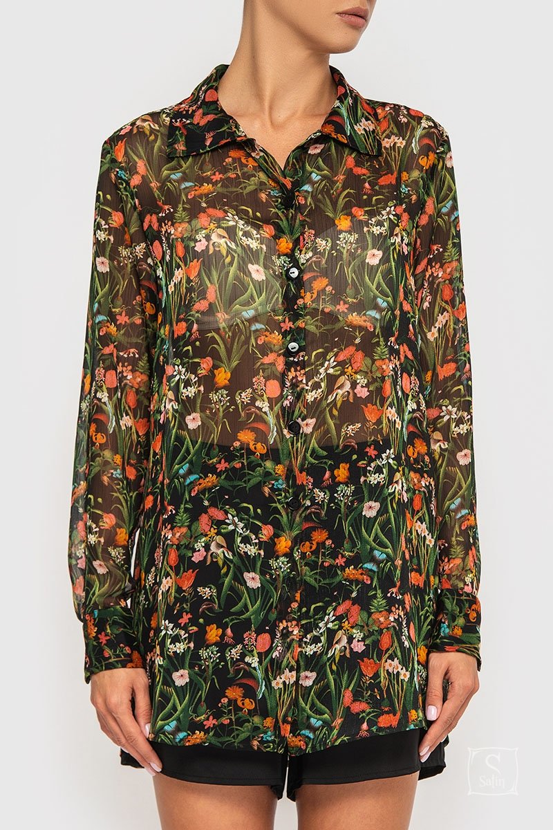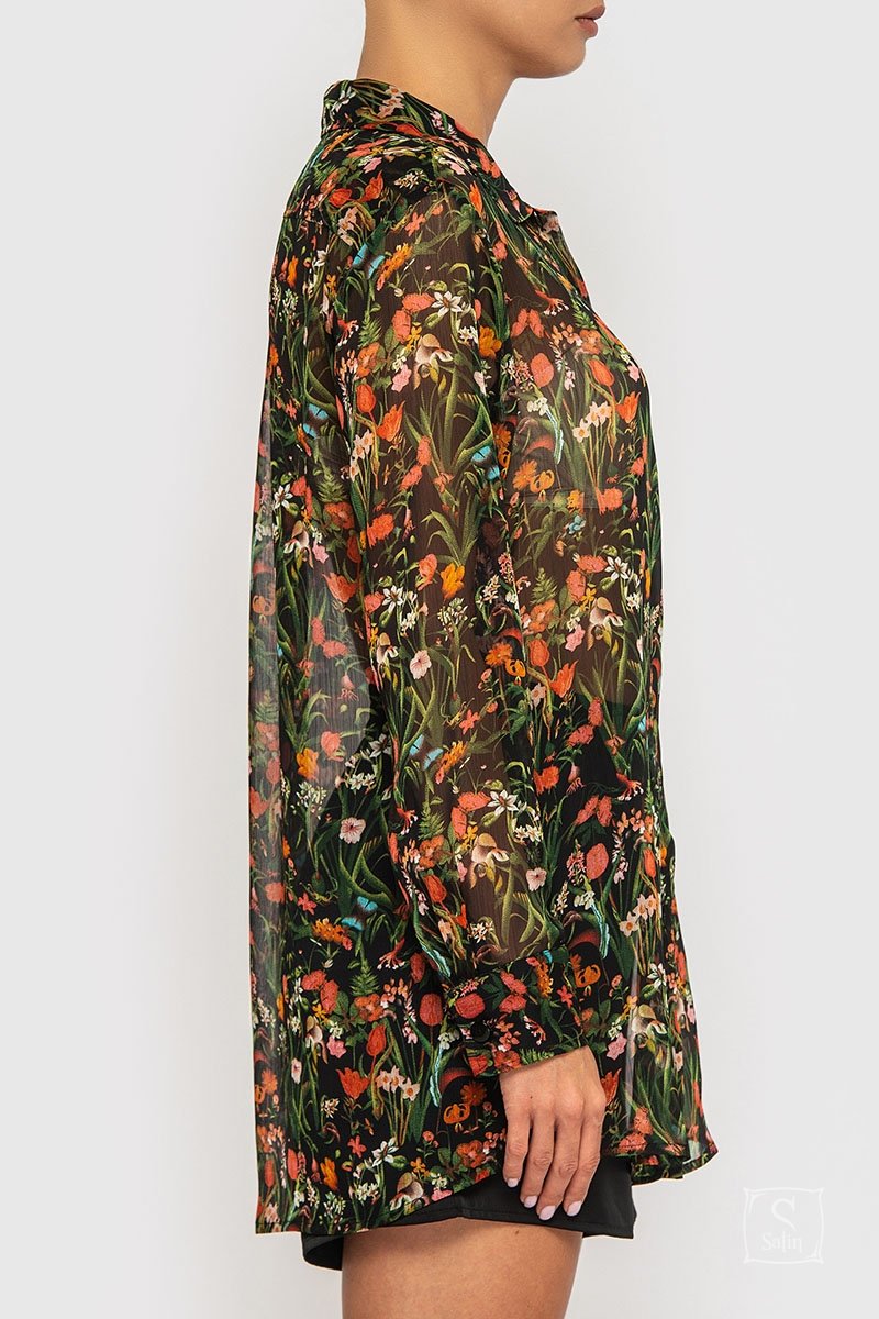 Универсальная женская шифоновая рубашка свободного кроя German Volf 21037 с цветочным принтом, которую можно носить как для повседневной носки, так и как пляжную рубашку.