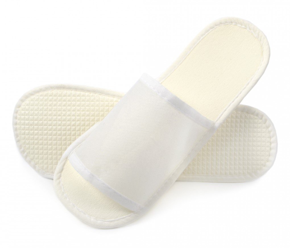 Изделие изготовлено из двух материалов: подошва - вспененный полиэтилен с антискользящим тиснением, а верхняя часть из экологически чистого материала - спанбонда. Тапочки окантованы тесьмой. Каждая пара тапочек в индивидуальной упаковке.