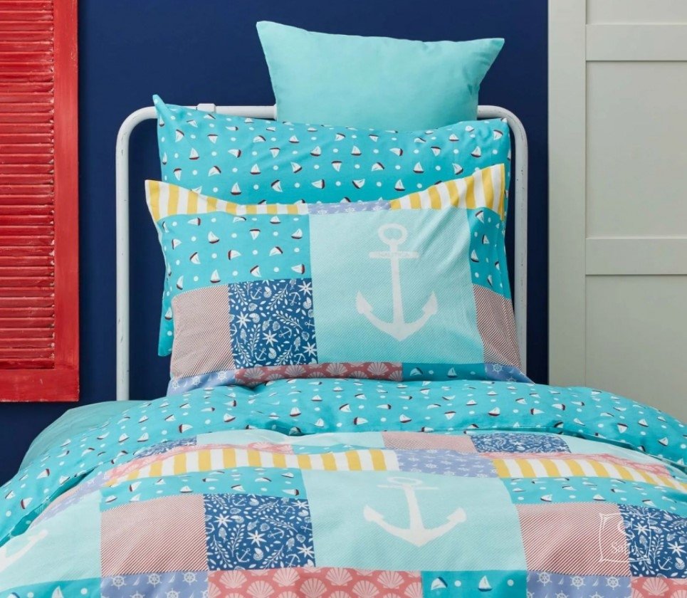 • Комплект Patch  выполнен в ментолово-разноцветных тонах с ярким морским принтом. Пододеяльник двусторонний, наволочка в тон пододеяльника, простынь ментолового цвета.