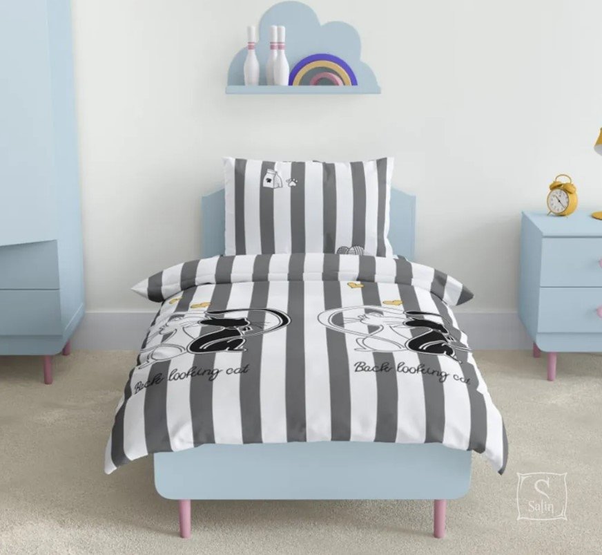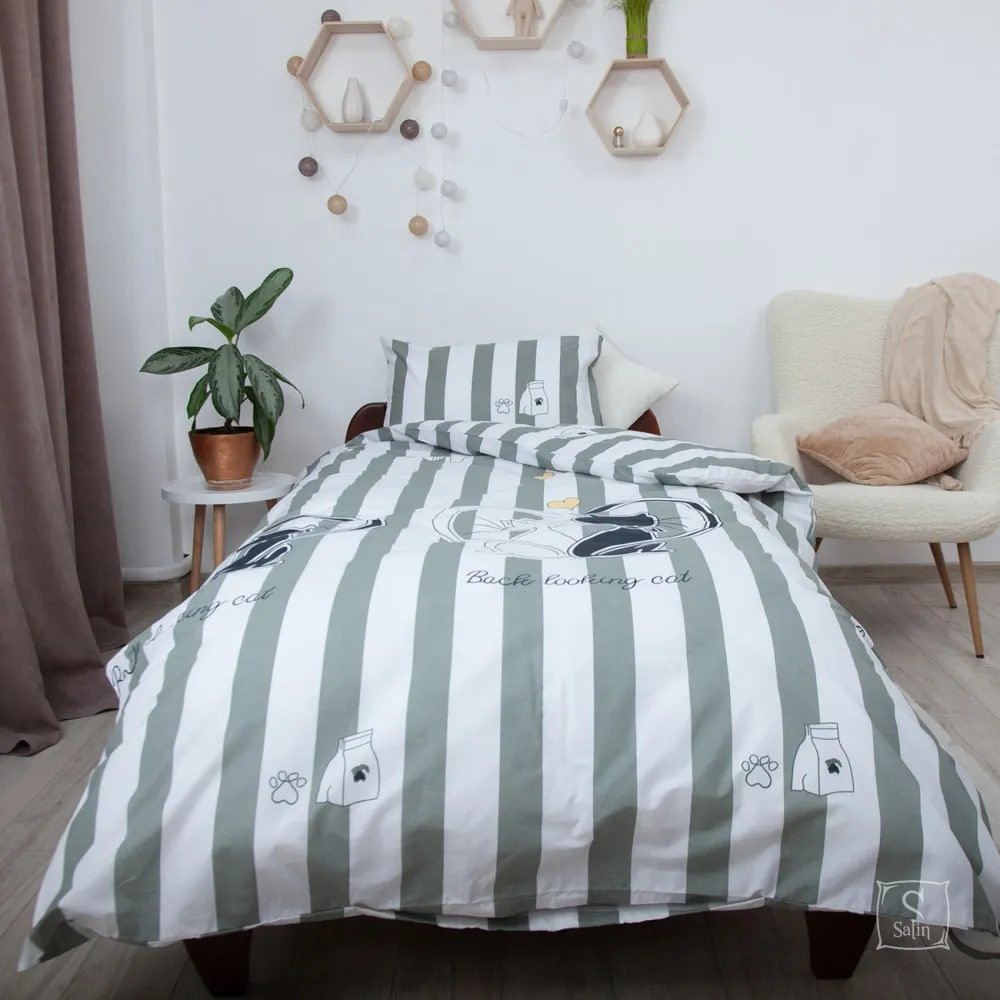 Постельное белье ТЕП Soft Dreams Кошачьи легенды выполнено в бело-серых тонах с узором полоска и котики.