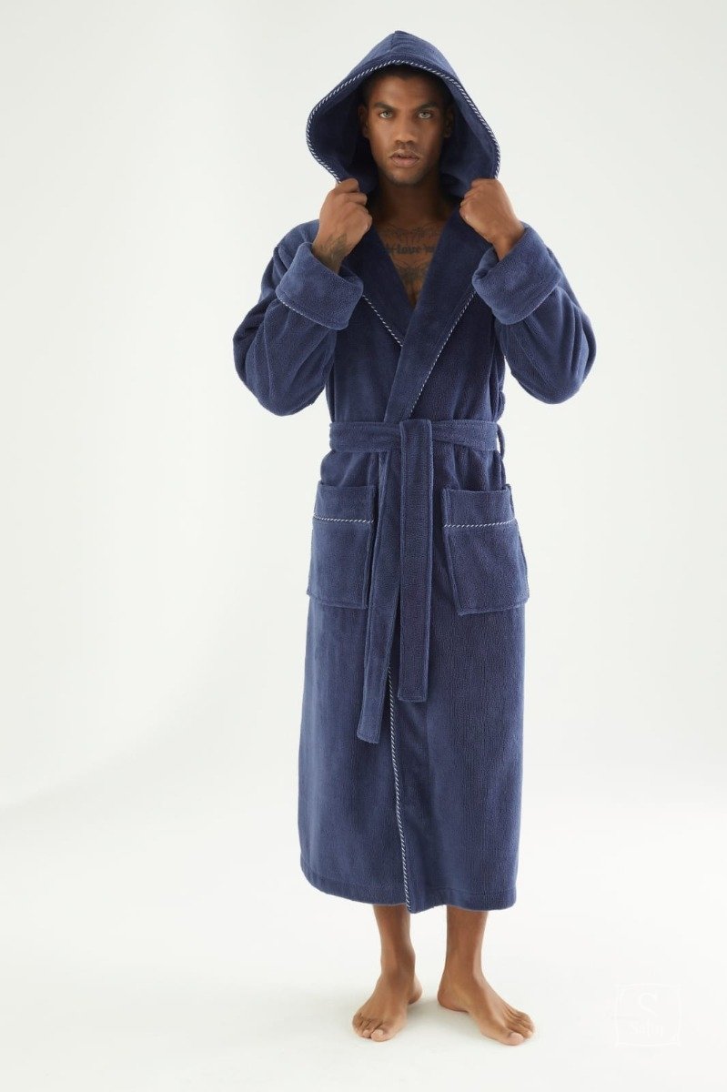 Длинный мужской халат Nusa 7230 дымчато-синего цвета, с капюшоном, карманами, на поясе. Полы и карманы украшены кантом.