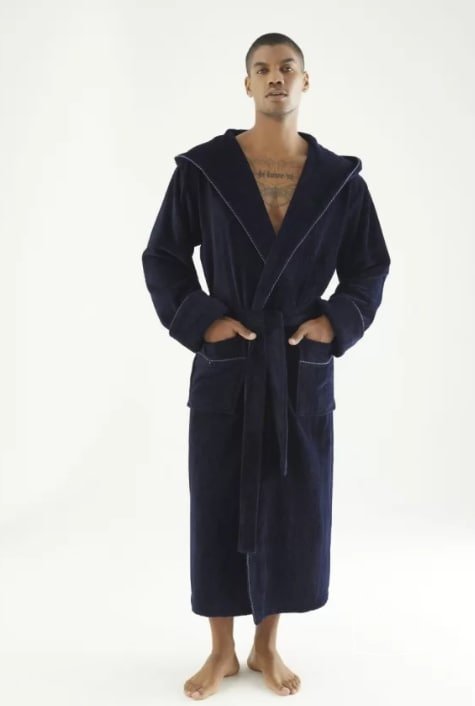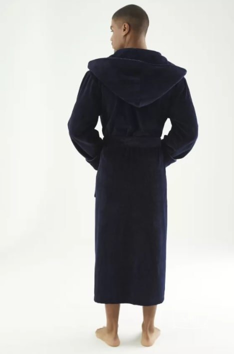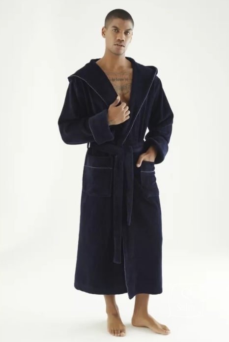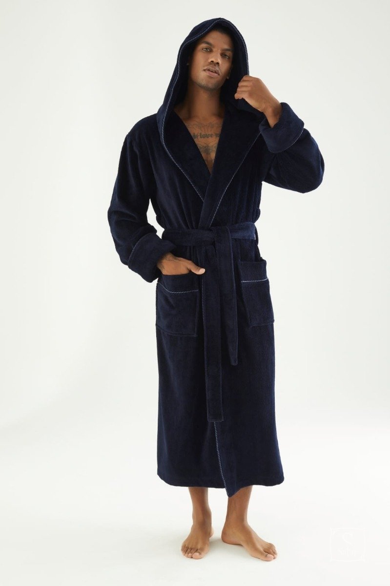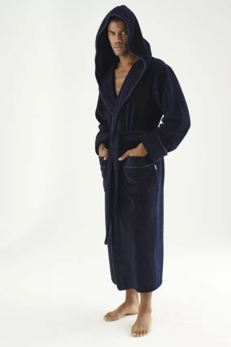 Длинный мужской халат Nusa 7230 темно-синего цвета, с капюшоном, карманами, на поясе. Полы и карманы украшены кантом.