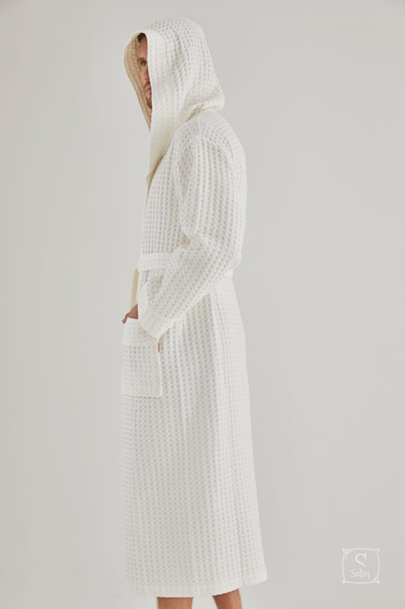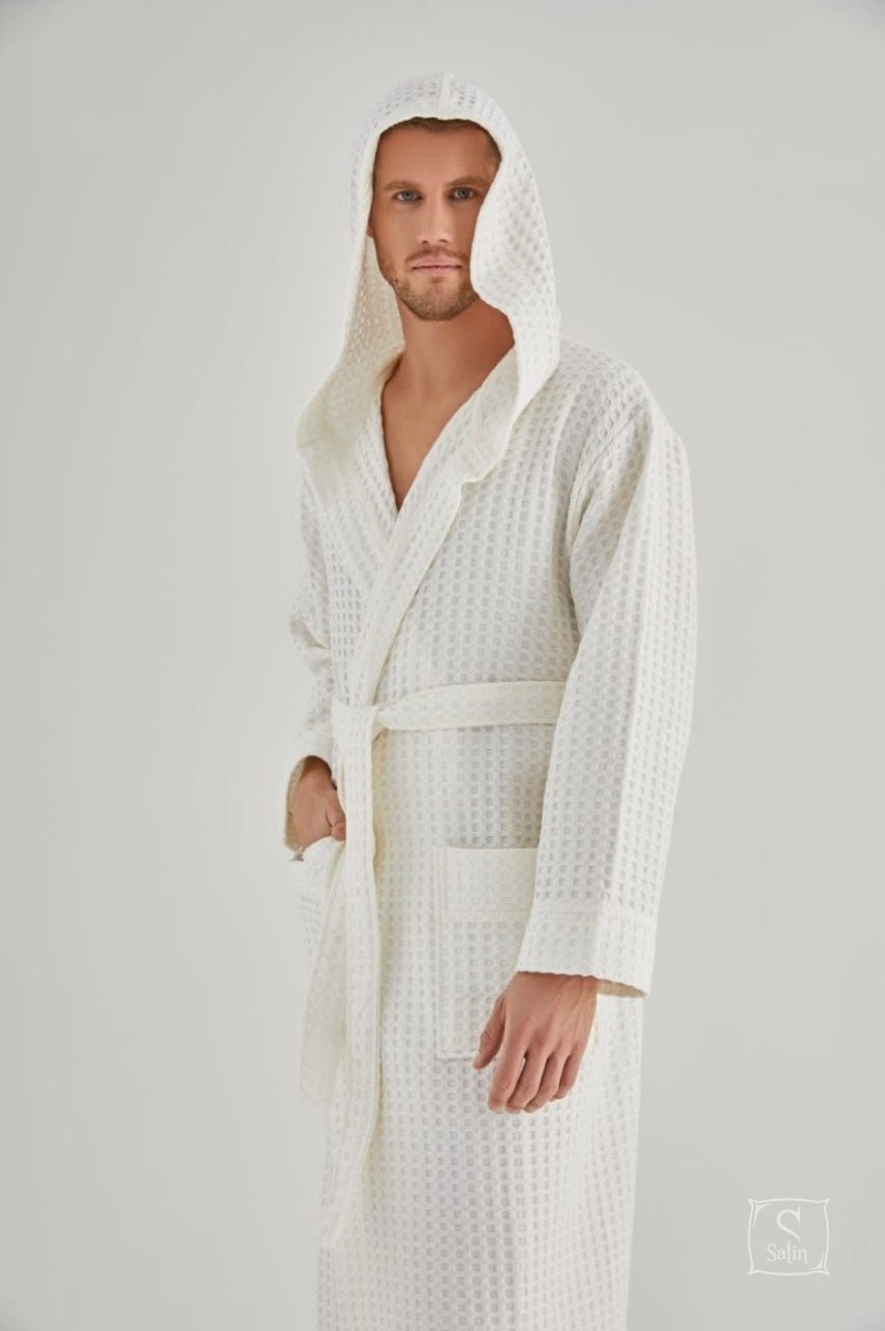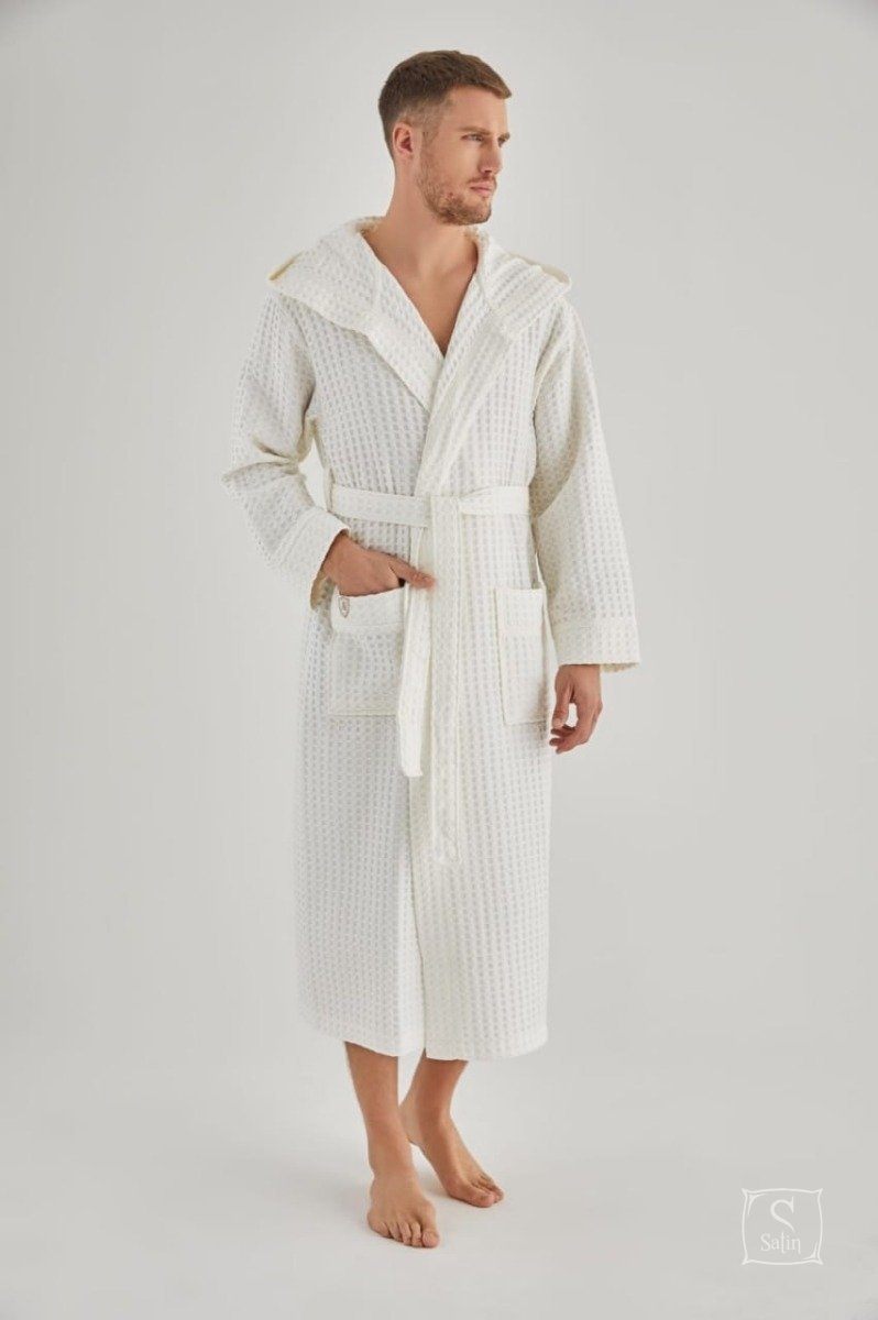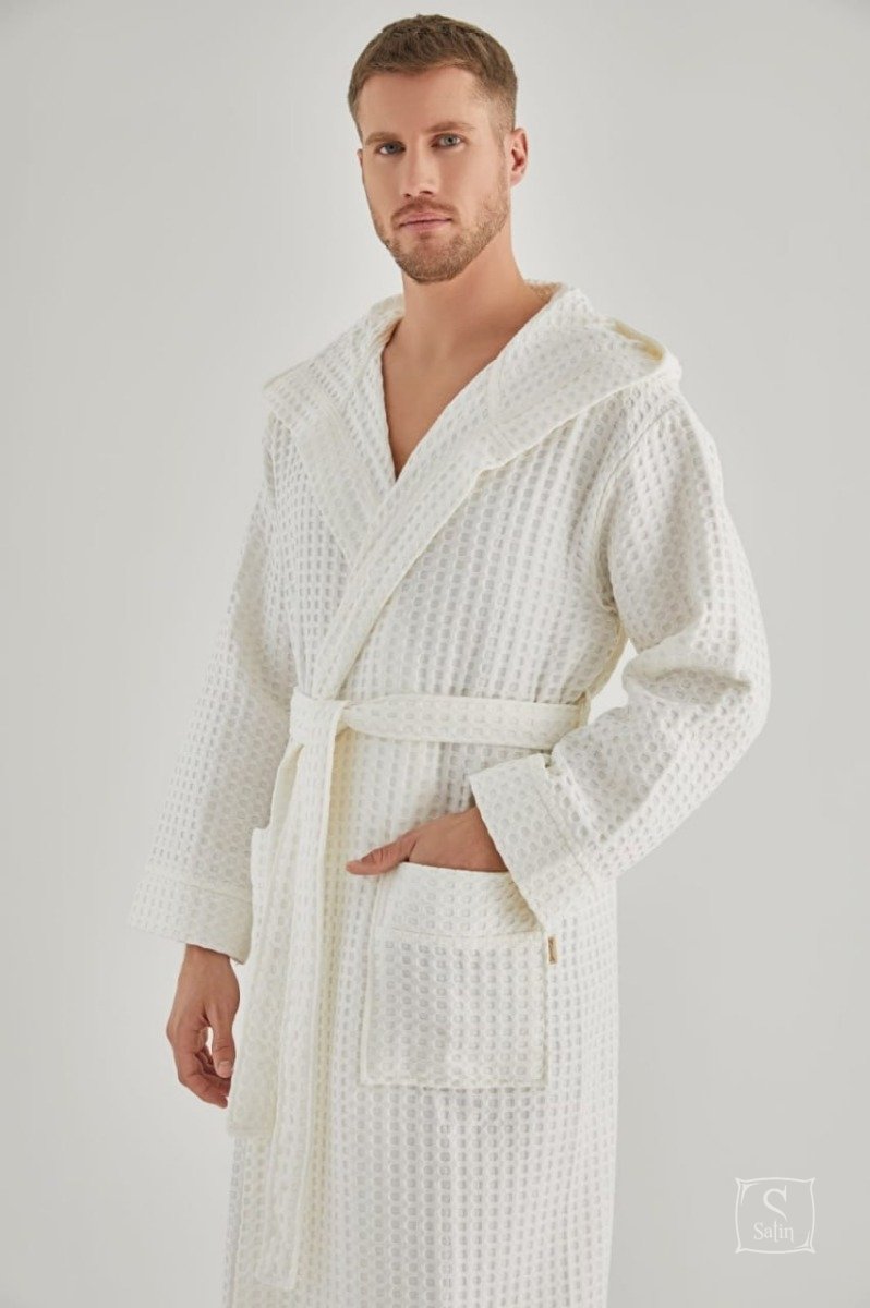 Мужской халат "Nusa" под пояс кремового цвета для дома и отдыха с капюшоном, карманами и рельефным узором клетка из смешанного бамбуково-хлопкового волокна идеален для осенне-весеннего сезона. В домашней одежде Nusa вы всегда будете выглядеть стильно и элегантно.