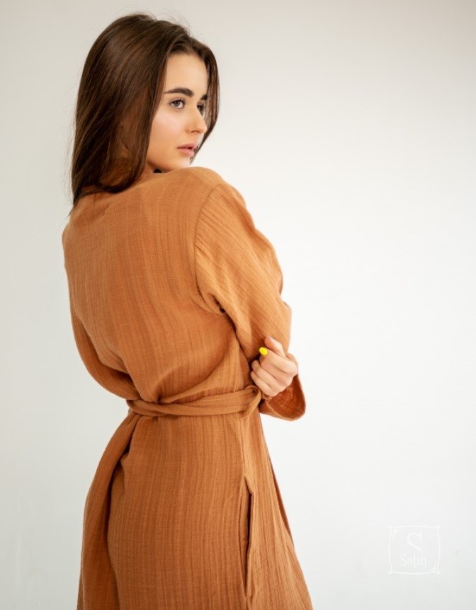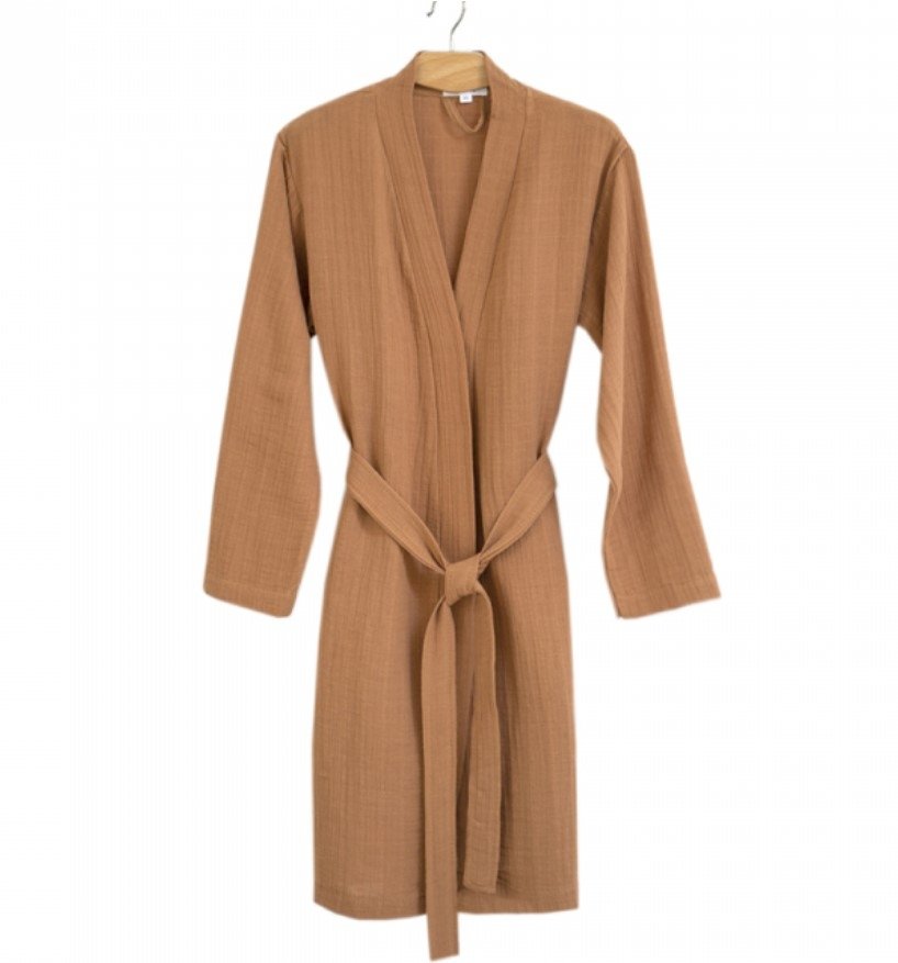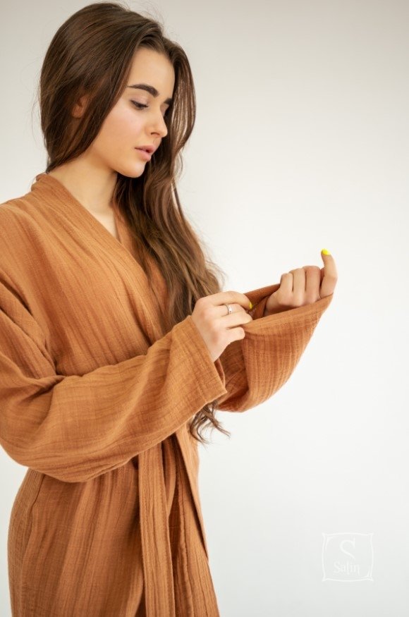 Классический халат-кимоно Muslin Indian Tan кирпичного цвета от турецкой ТМ Barine выполнен из натурального высококачественного муслинового хлопка, который неверятно тонкий и легкий, но при этом обладает высокой прочностью и износостойкостью, позволяет коже дышать, защищает от ультрафиолетовых лучей, гигиеничный и экологичный.