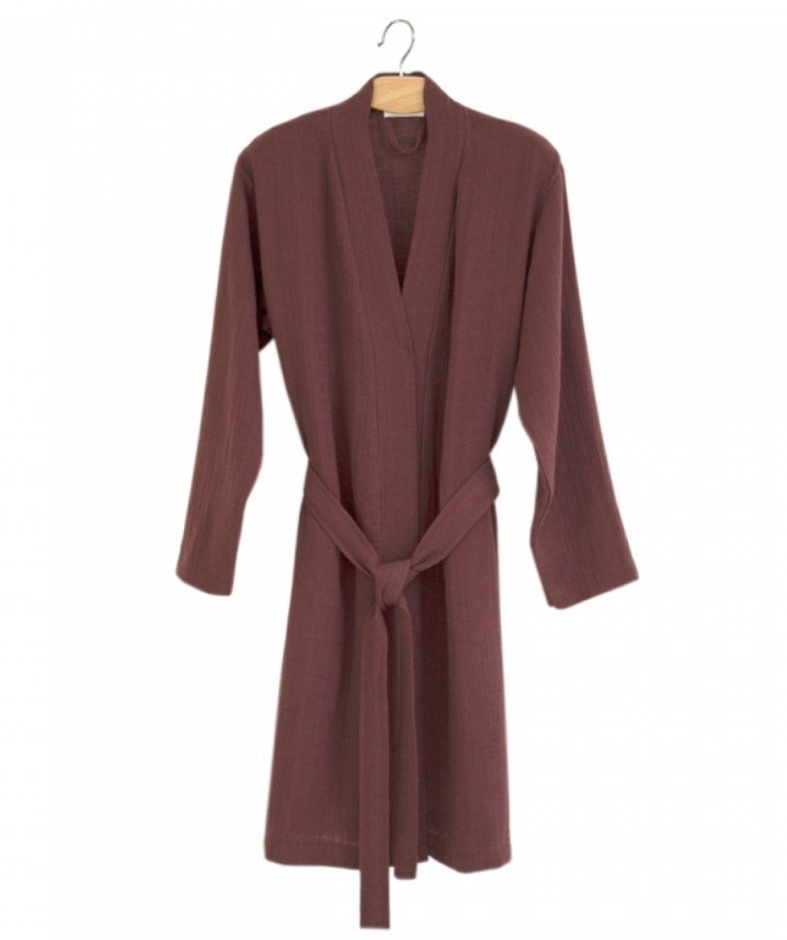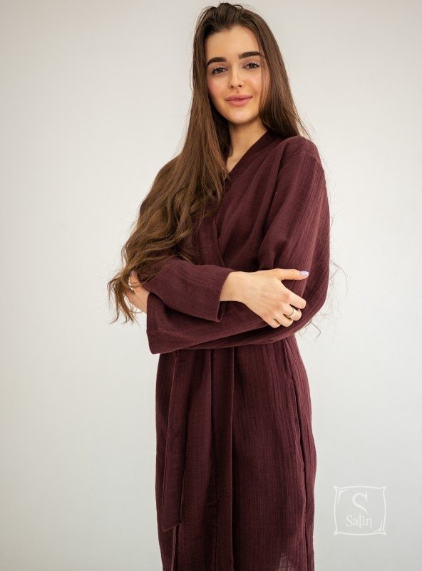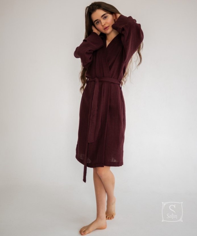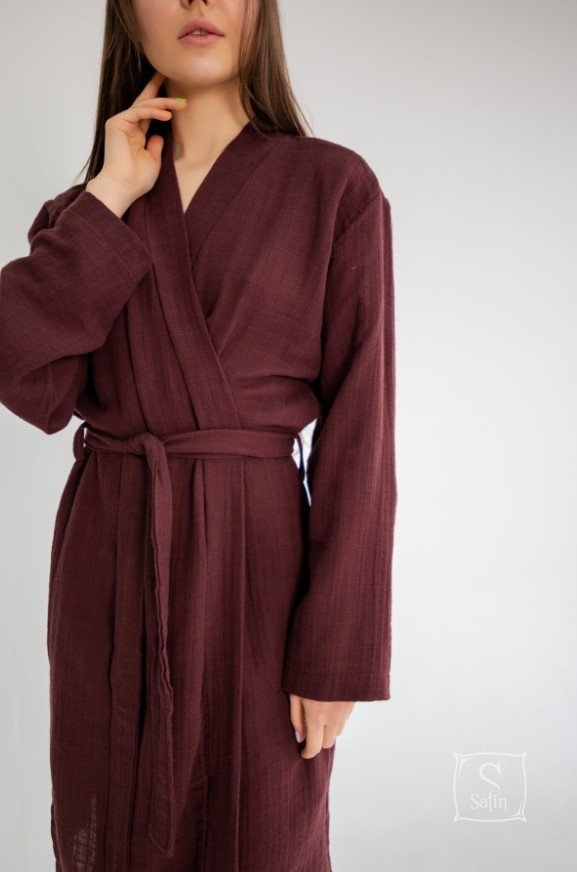 Классический халат-кимоно Muslin Wine бордового цвета от турецкой ТМ Barine выполнен из натурального высококачественного муслинового хлопка, который неверятно тонкий и легкий, но при этом обладает высокой прочностью и износостойкостью, позволяет коже дышать, защищает от ультрафиолетовых лучей, гигиеничный и экологичный.