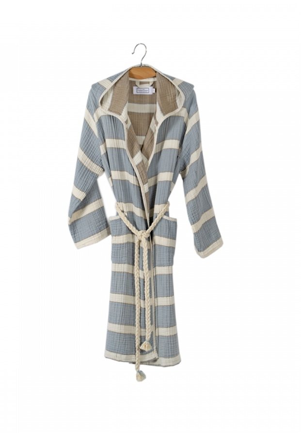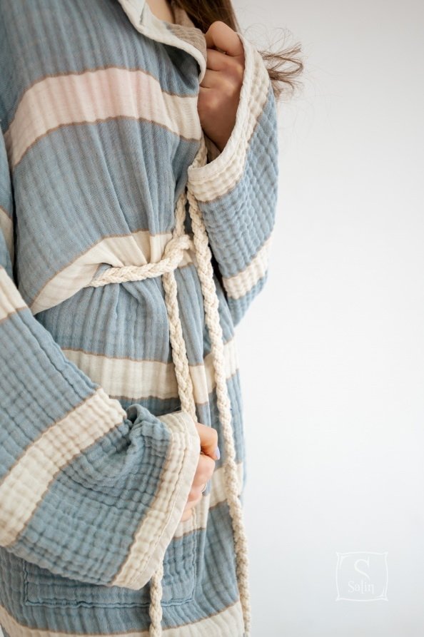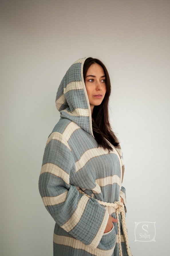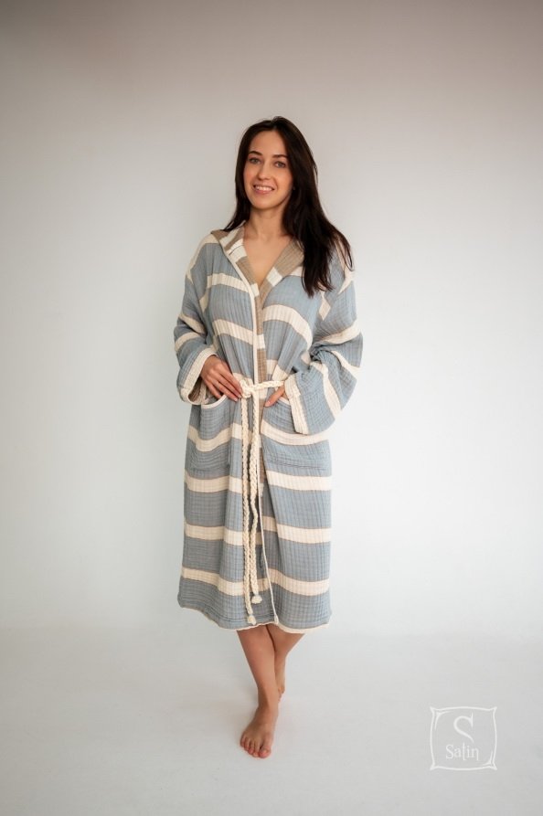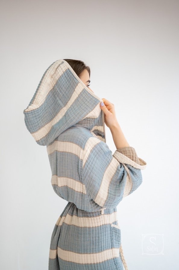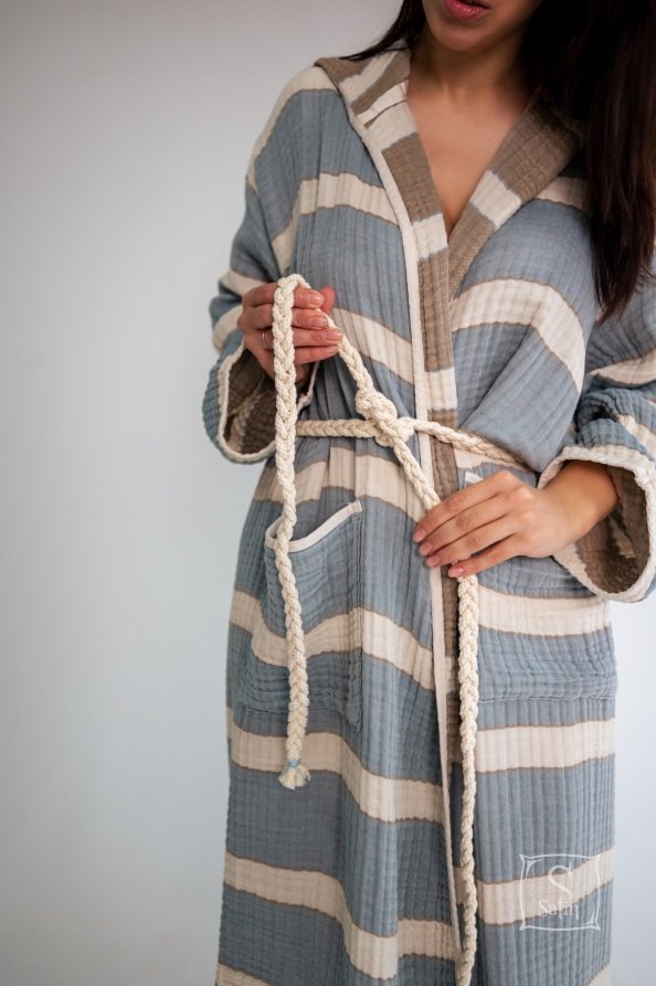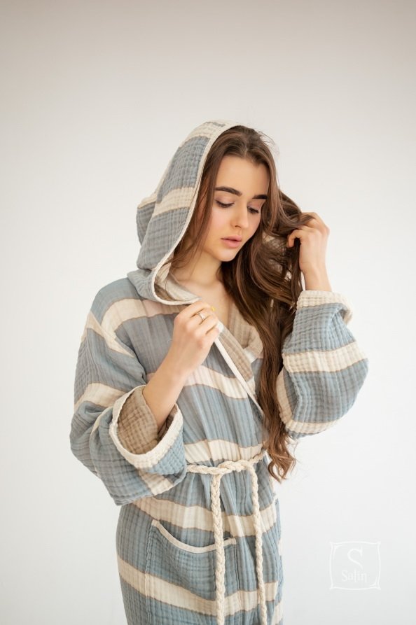 Халат Lotus Milana muslin lead blue-khaki прямого кроя с капюшоном, карманами, на запах под красивый пояс идеально подходит для посещения бассейна, пляжа или для использования после банных процедур. Халат из муслинового хлопка отлично впитывает влагу, остается мягким после стирок. Производитель: ТМ Lotus (Турция).