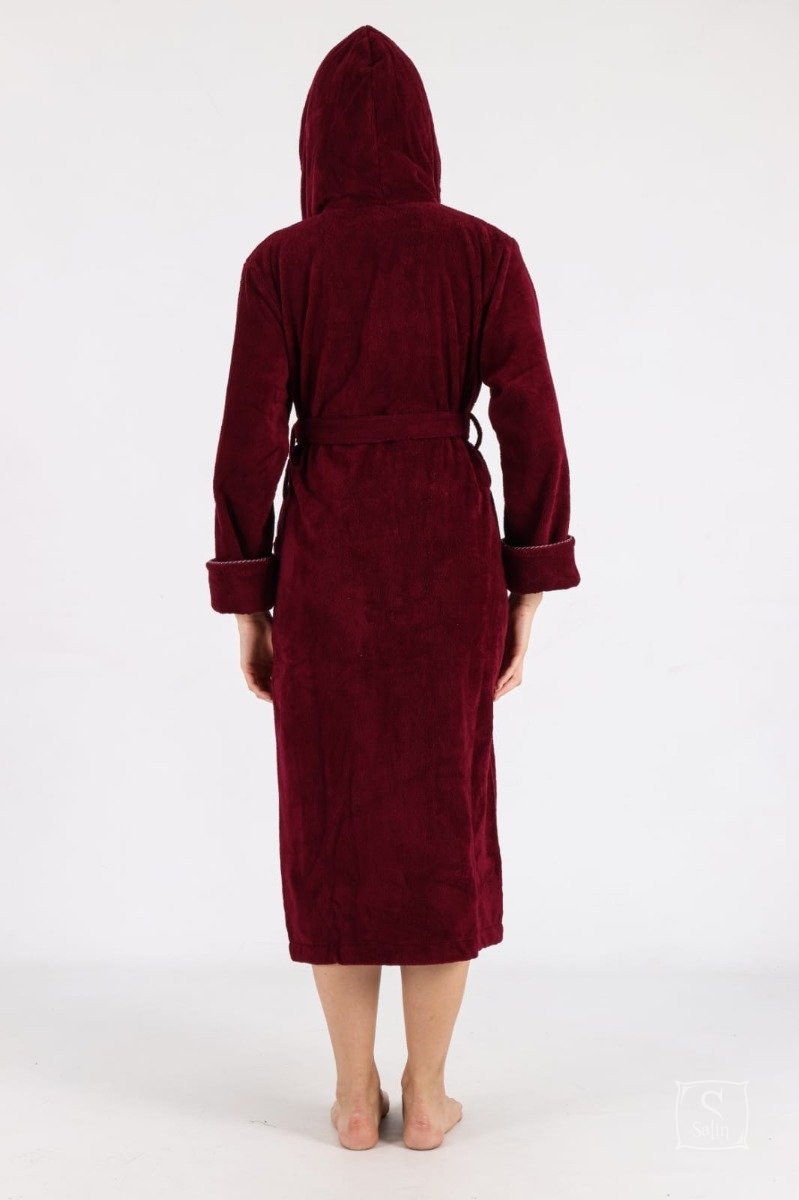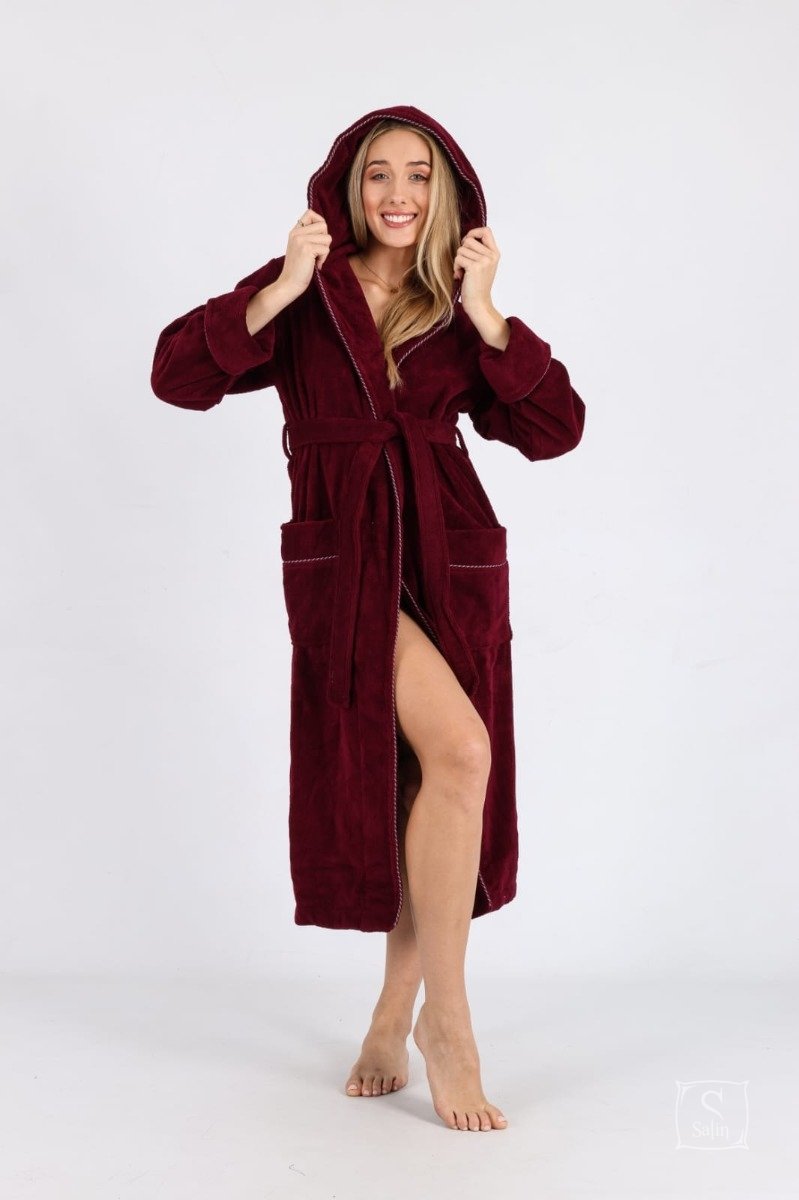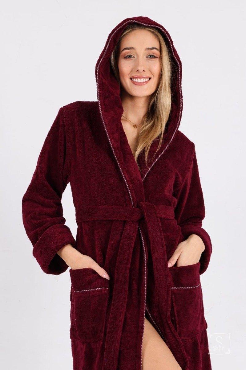 Длинный женский махровый бамбуковый халат с капюшоном Nusa 6890 бордового цвета, карманами, на поясе. Полы и карманы украшены кантом.