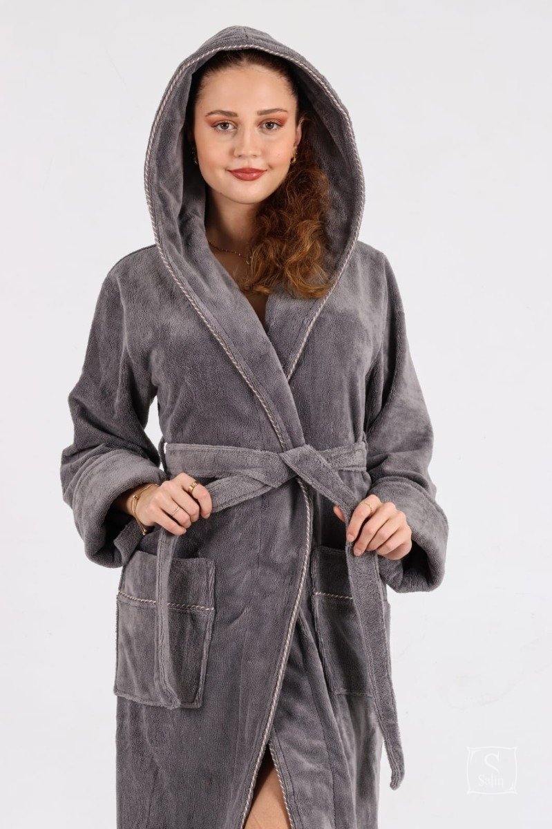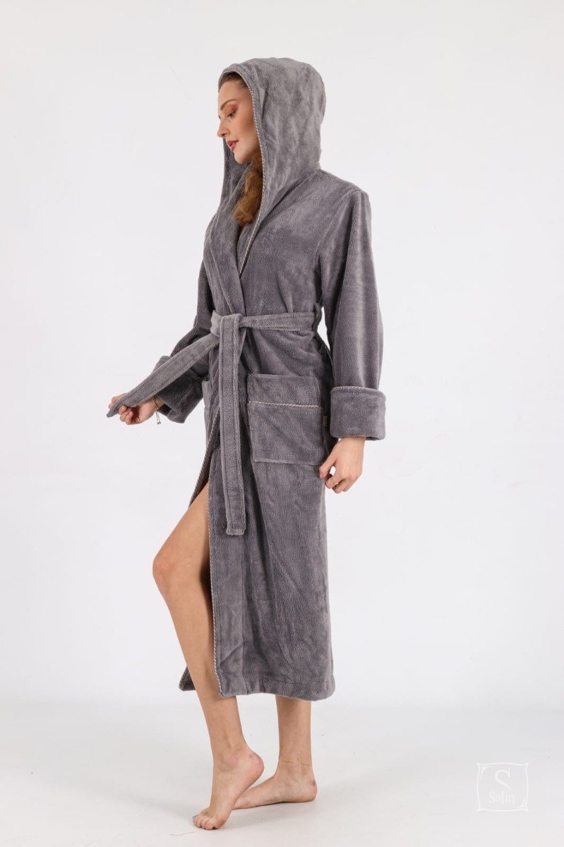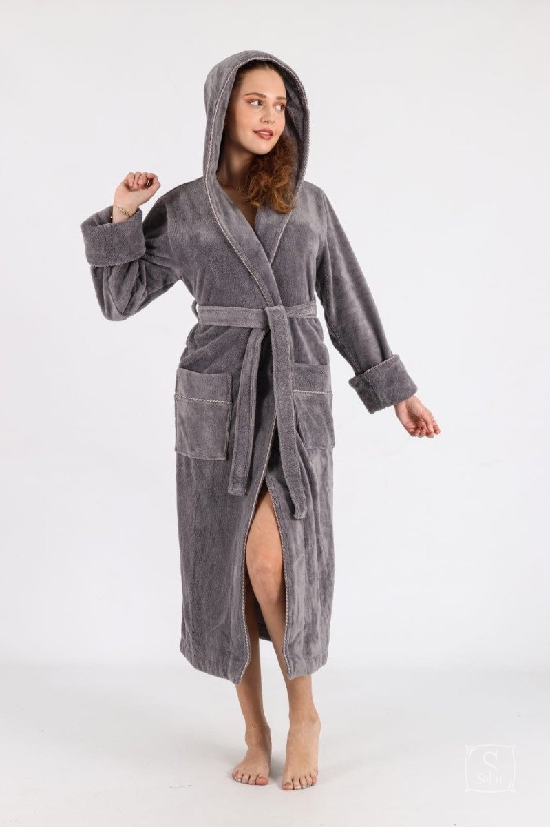 Длинный женский махровый бамбуковый халат с капюшоном Nusa 6890 серого цвета, карманами, на поясе. Полы и карманы украшены кантом.