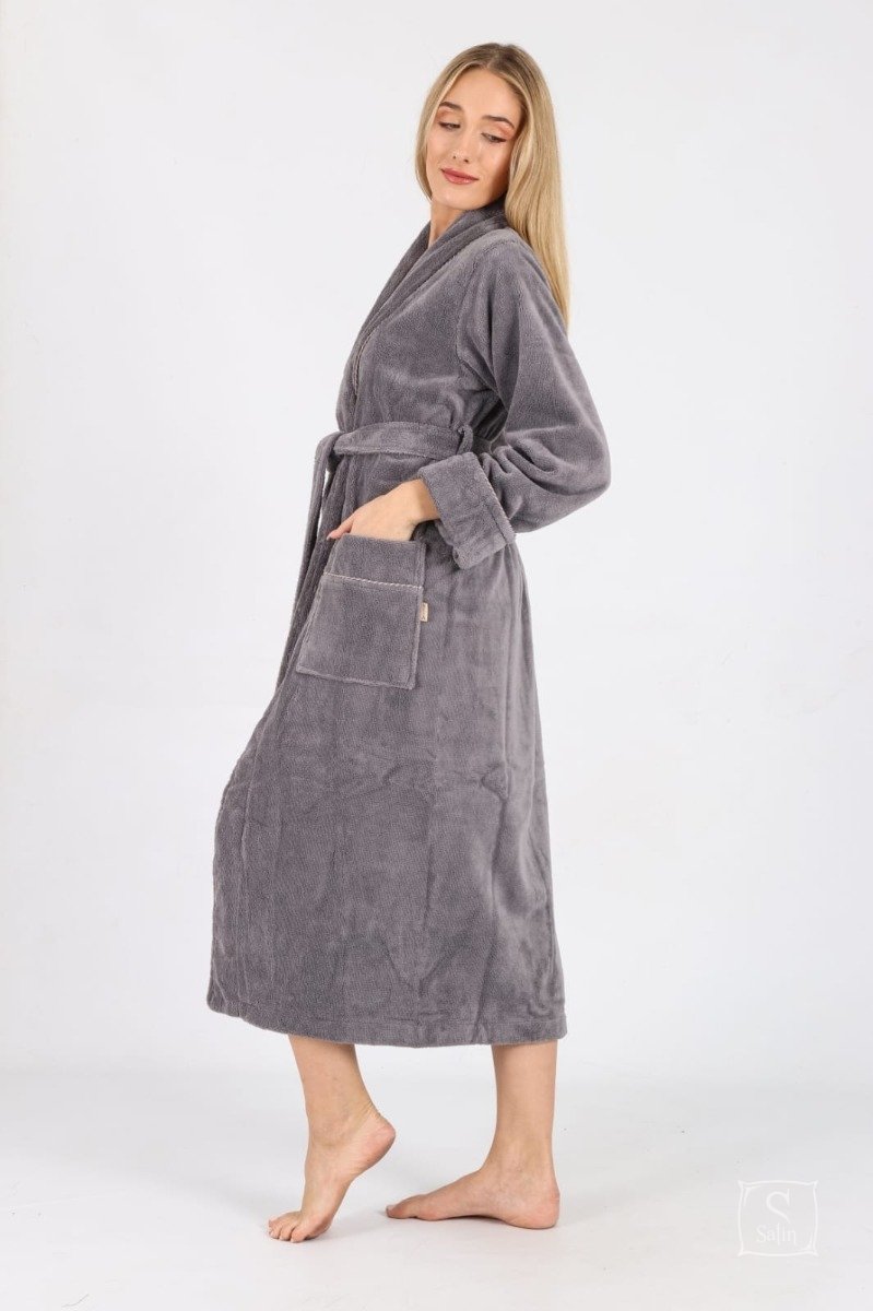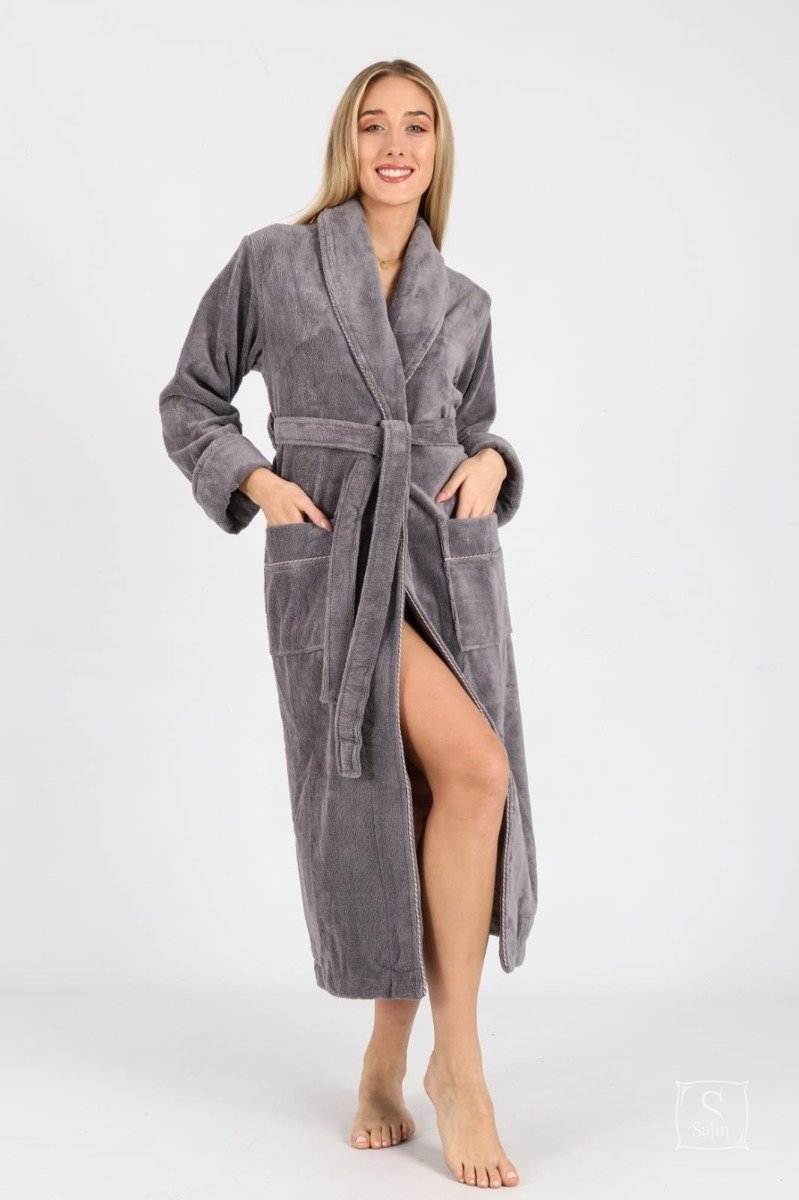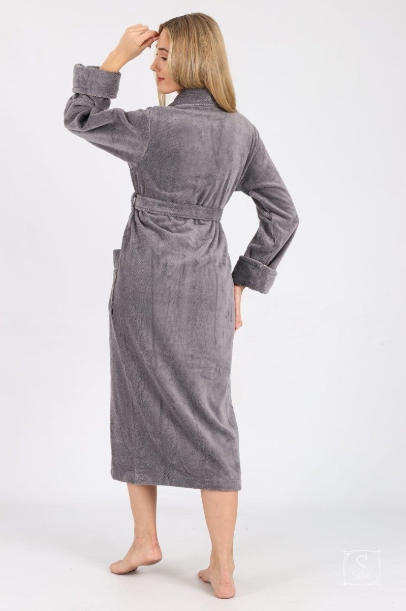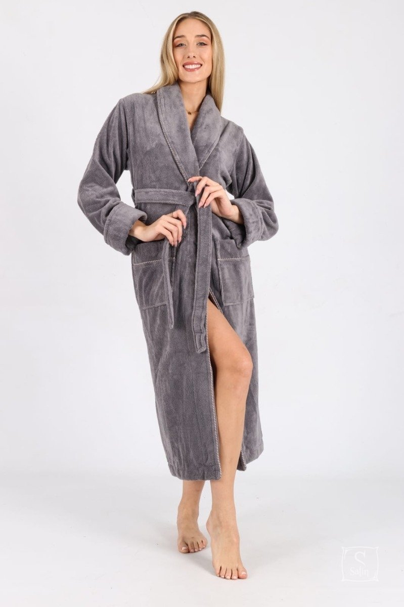 Длинный женский махровый бамбуковый халат с шалевым воротником Nusa 6895 серого цвета, карманами, на поясе. Полы и карманы украшены кантом.