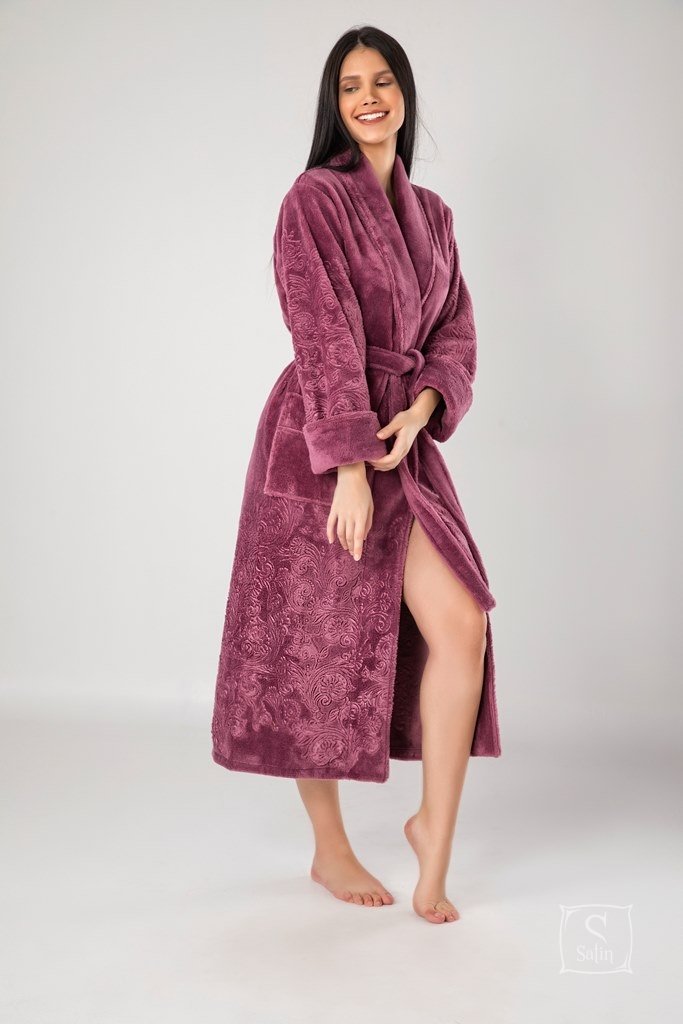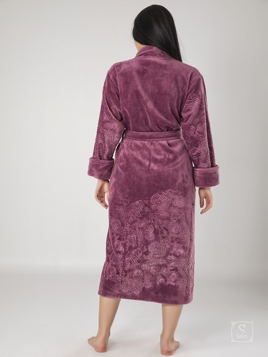 Длинный женский халат "Nusa" ns 8650 баклажан светло-фиолетового цвета без капюшона. Изготовлен из бамбука, мягкий и приятный к телу. Полы халата и рукава украшены витиеватым рельефным узором. Прекрасный подарок любимым людям к праздникам.