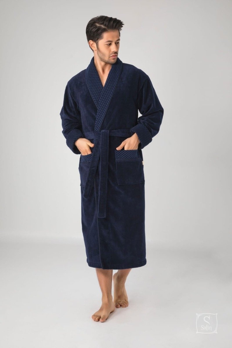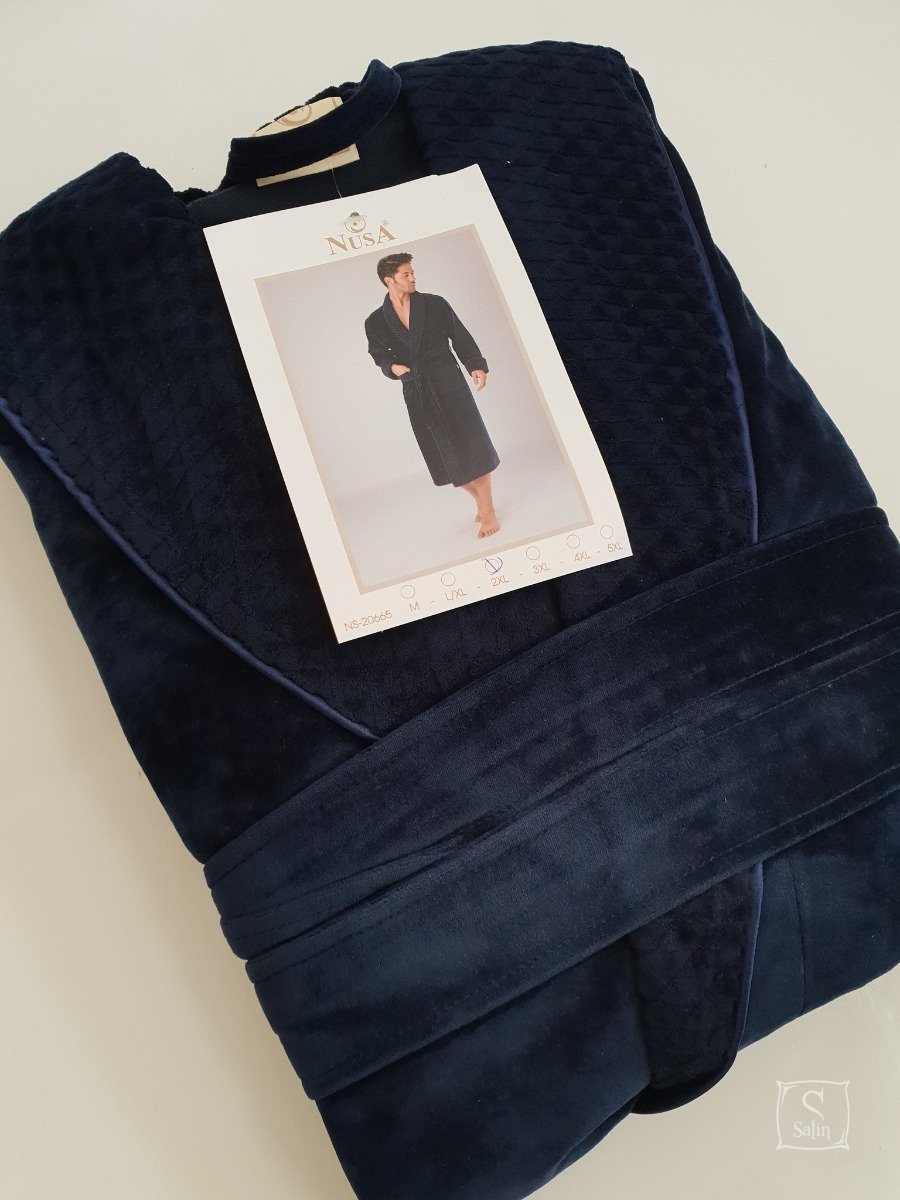 Длинный мужской халат "Nusa" ns 20665 lacivert темно-синего цвета с двумя карманами. Отложной воротник, рукава и карманы украшены геометрическим узором. Халат выполнен: внутренняя отделка - 100% хлопок, тонкий трикотаж, верх - 100% хлопок, велюровая махра, полы халата удерживаются удобным широким поясом. Прекрасный подарок любимым людям к праздникам.