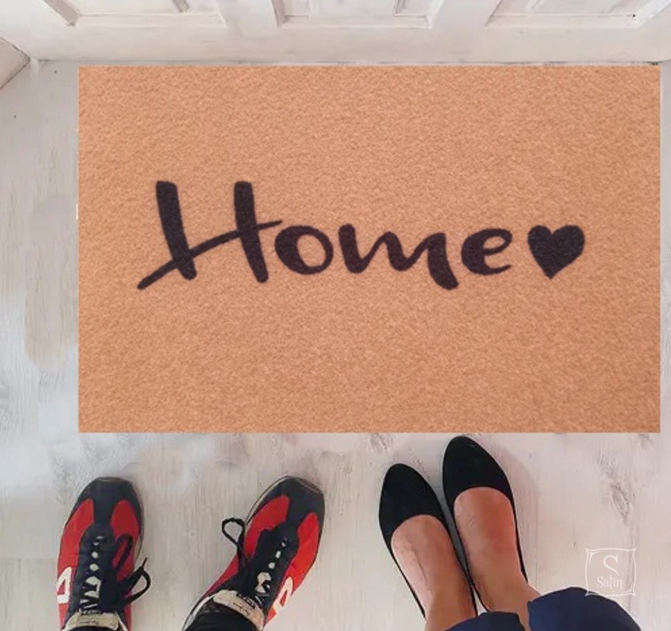 Прямоугольный придверный коврик IzziHome Perla Kapi Paspasi Bej Home Kalp выполнен в бежевом цвете с надписью "Home" и сердечком. Подходит для использования как в помещении, так и на улице. Состав: 100% полиэстер.