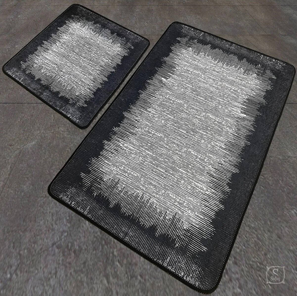 Набор ковриков для ванной Chilai Home Esper включает в себя два коврика выполненых в серо-черных тонах с узором абстракция. Коврики Chilai Home выполнены без ворса из 100% полиэстера, с антискользящим покрытием, толщиной 0,5 см.