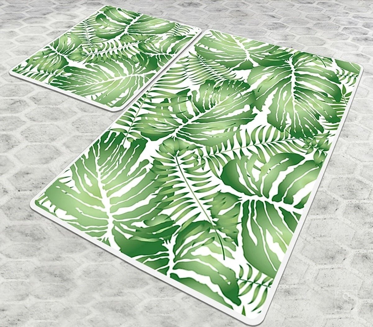 Набор ковриков для ванной Chilai Home Pied включает в себя два коврика выполненых в зеленых тонах с узором листья. Коврики Chilai Home выполнены без ворса из 100% полиэстера, с антискользящим покрытием, толщиной 0,5 см.
