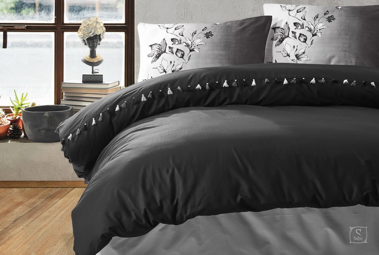 • Комплект Daren siyah выполнен в серо-черном тоне. Использованы ткани-компаньоны. Пододеяльник выполнен в однотонном цвете и украшен кисточками, наволочки и простынь выполнены в едином стиле.