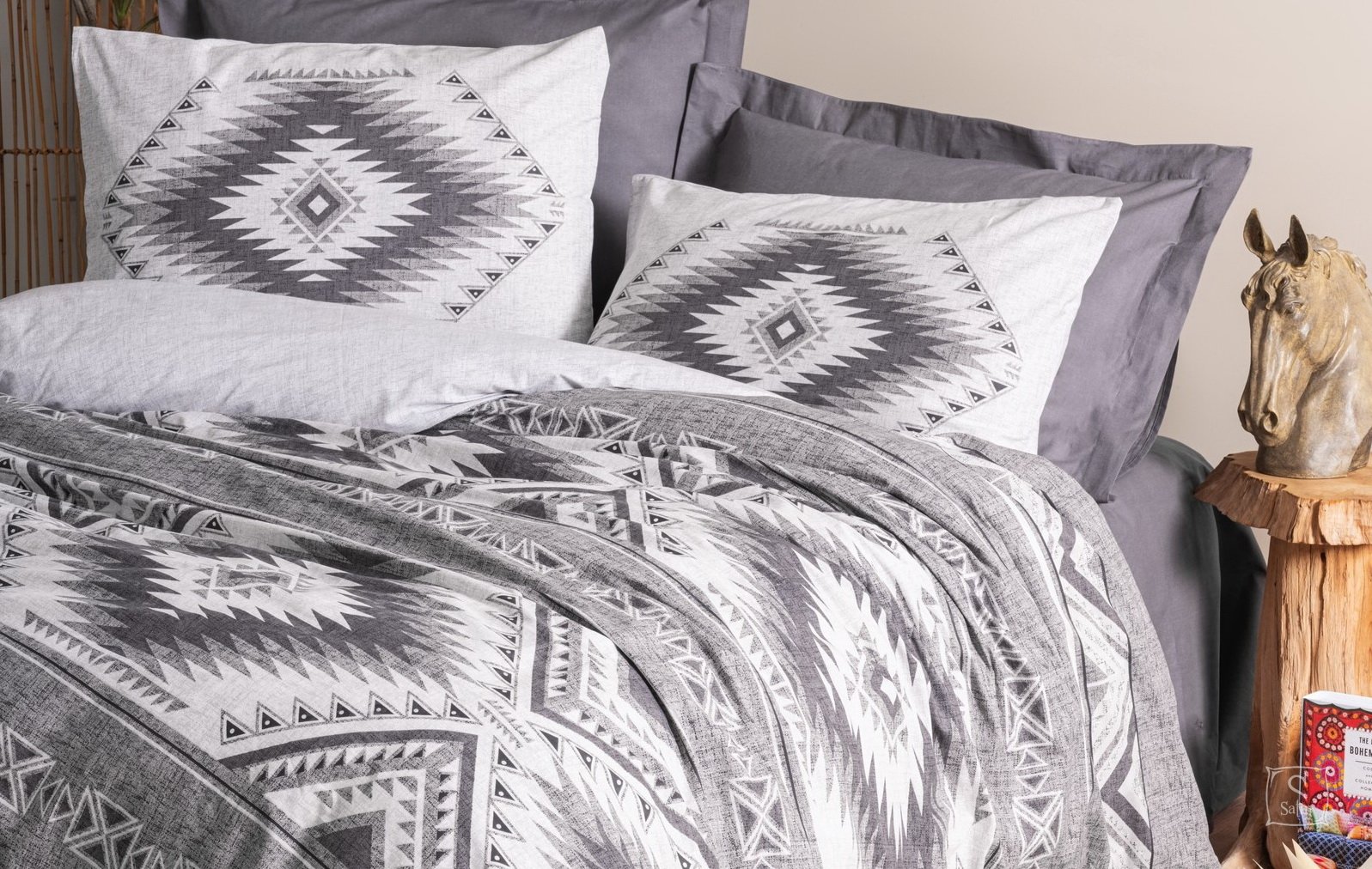 • Комплект Ethnic Delos antrasit выполнен в серых тонах с узором геометрия. Использованы ткани-компаньоны.