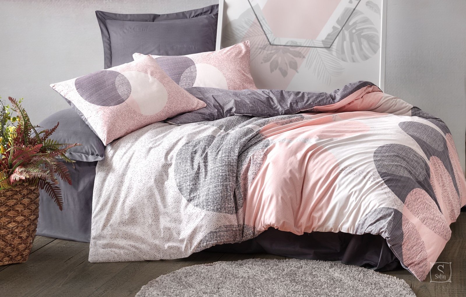 • Комплект Leron выполнен в серо-персиковых тонах с узором круги. Использованы ткани-компаньоны.