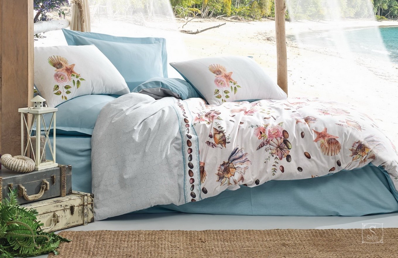• Комплект Pebbly mavi выполнен в голубых тонах с принтом ракушки. Использованы ткани-компаньоны.