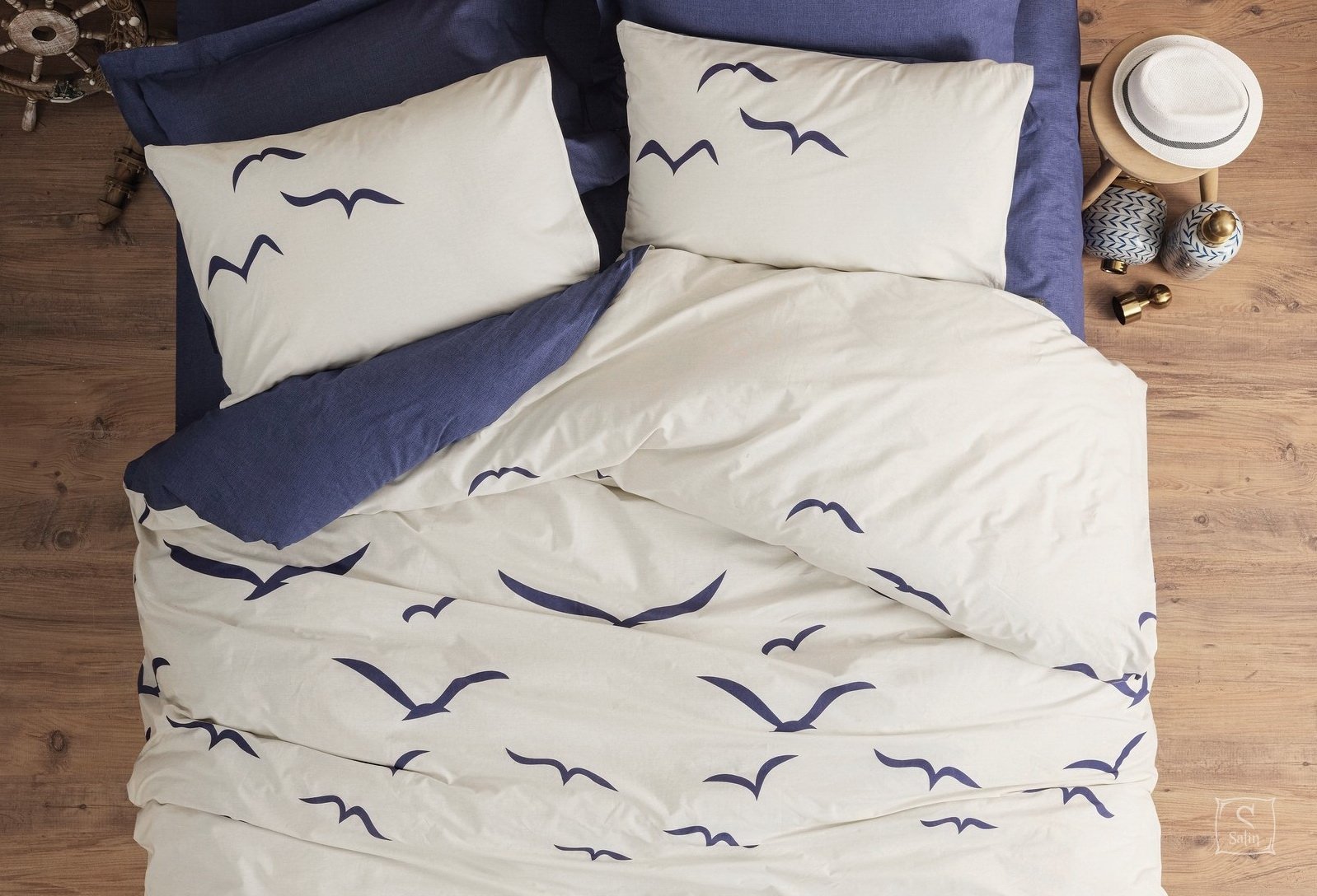 • Комплект Larum lacivert выполнен  в бело-синих тонах с принтом чайки. Использованы ткани-компаньоны.