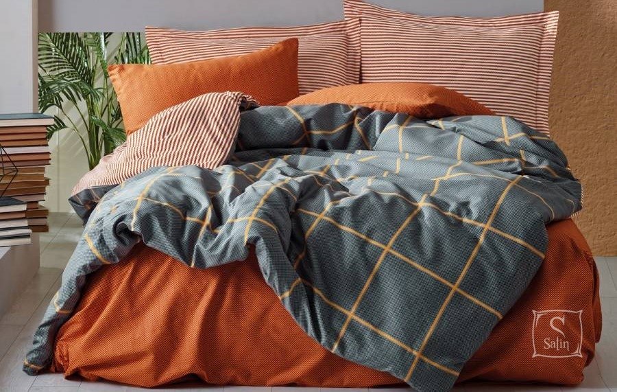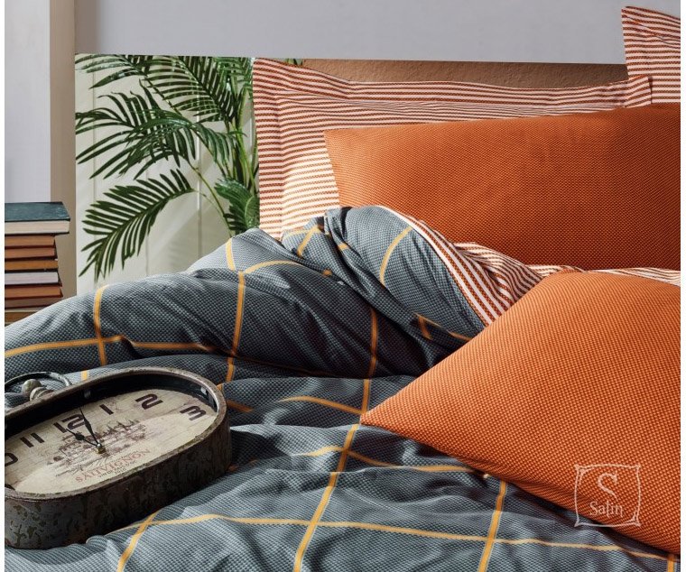 • Комплект Stark tarcin выполнен  в серо-оранжевых тонах с принтом клетка и полоска. Использованы ткани-компаньоны.