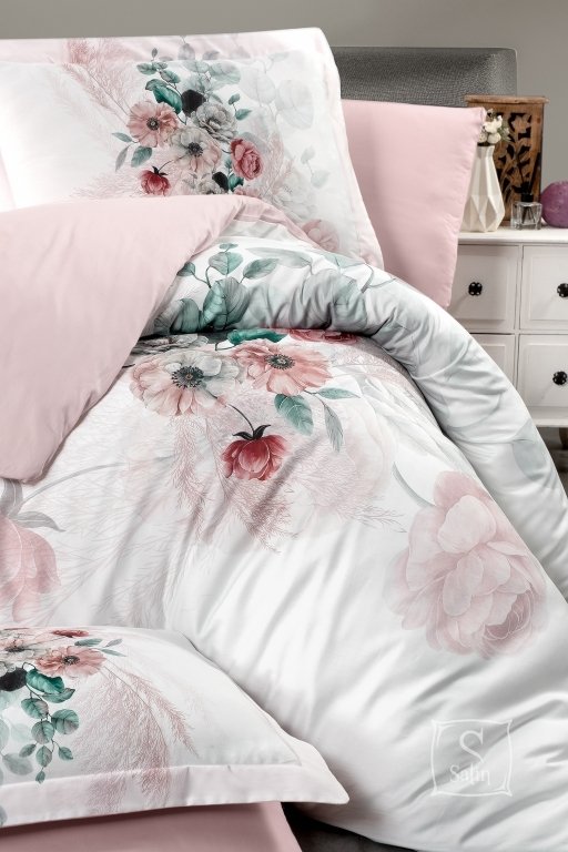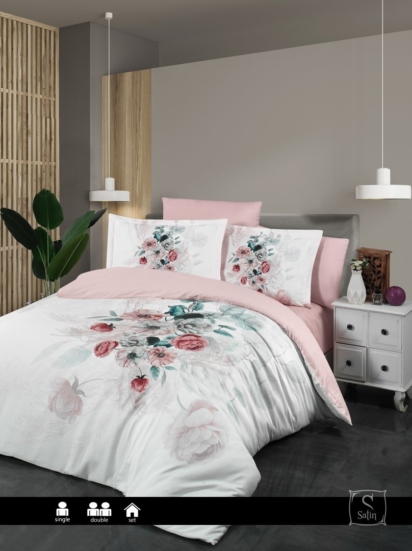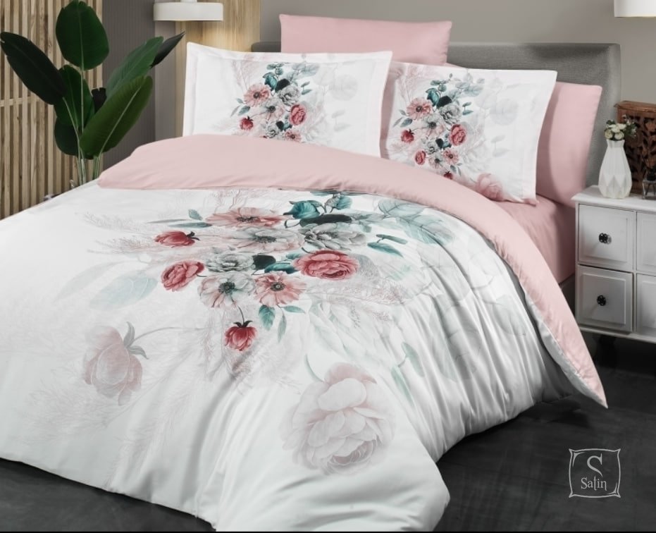 • Материал и дизайн: Комплект изготовлен из нежного сатина, а его цветовая гамма в розовых тонах на белом фоне добавляет особый шарм и праздничное настроение.