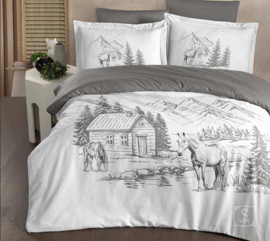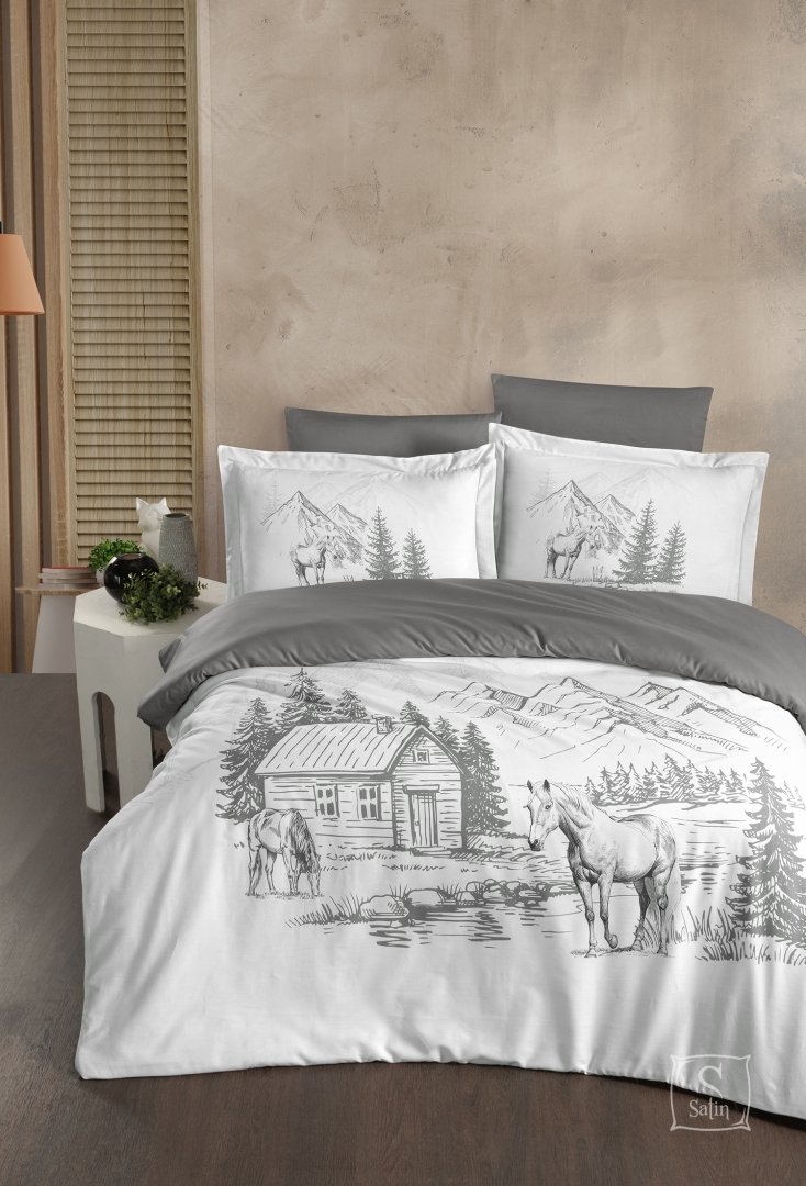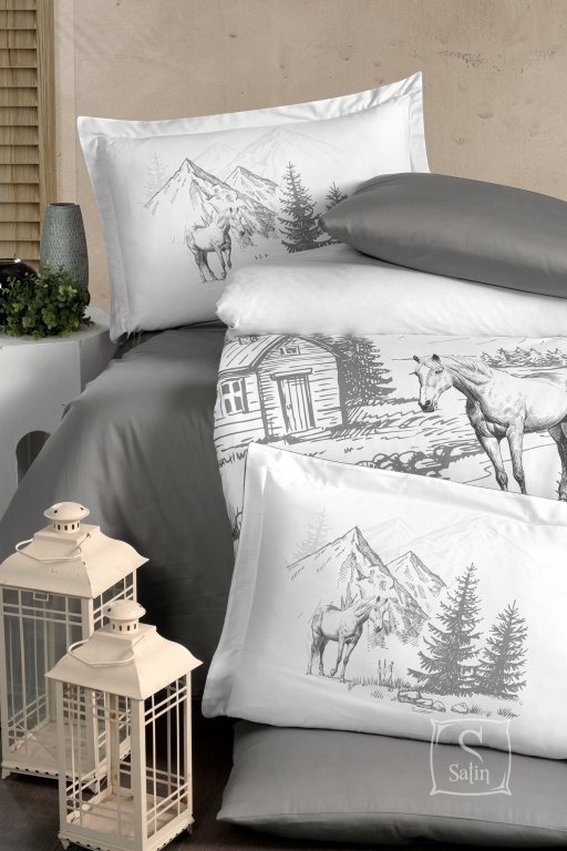 • Материал и дизайн: Комплект изготовлен из нежного сатина, а его цветовая гамма в серых тонах на белом фоне добавляет особый шарм и праздничное настроение.