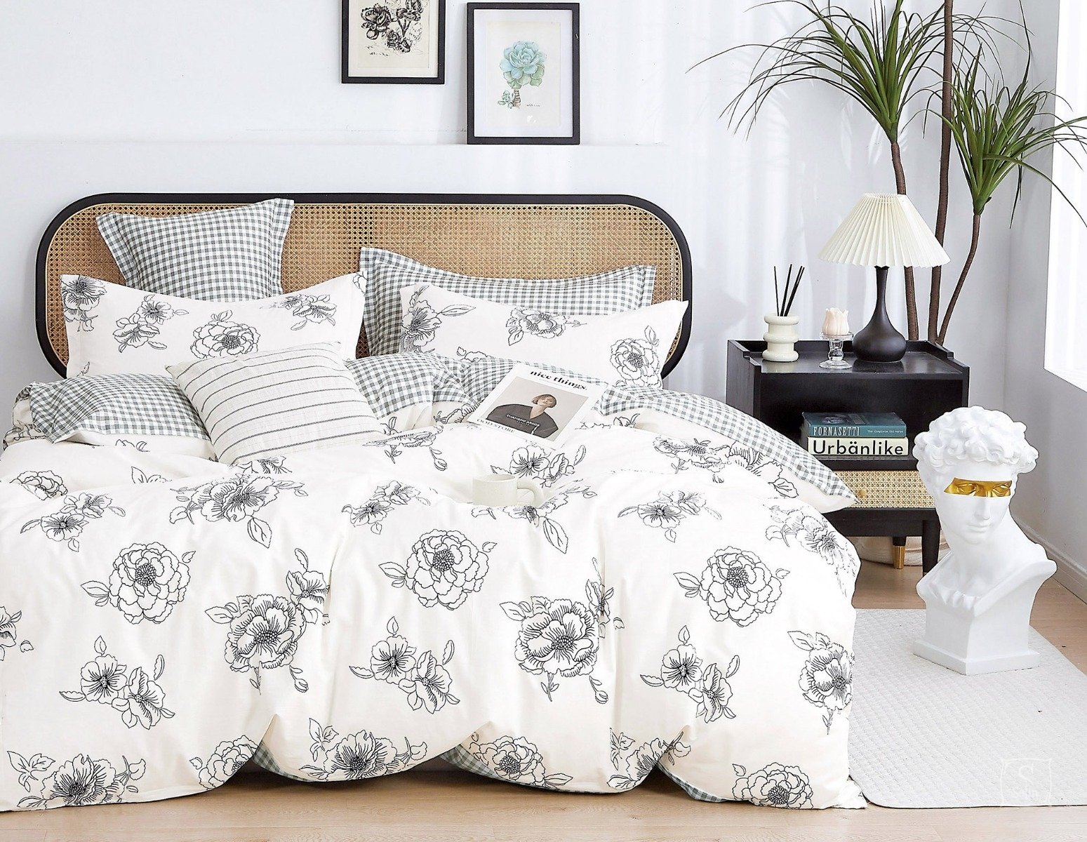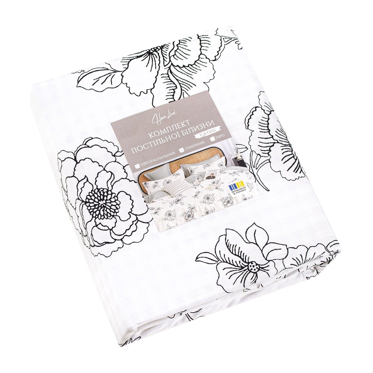 Комплект Home Line Сатин "Біла півонія" выполнен в бело-серых тонах с цветочным принтом.