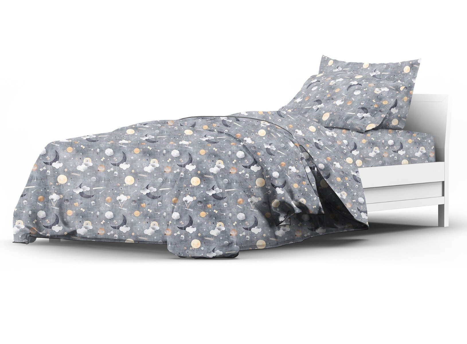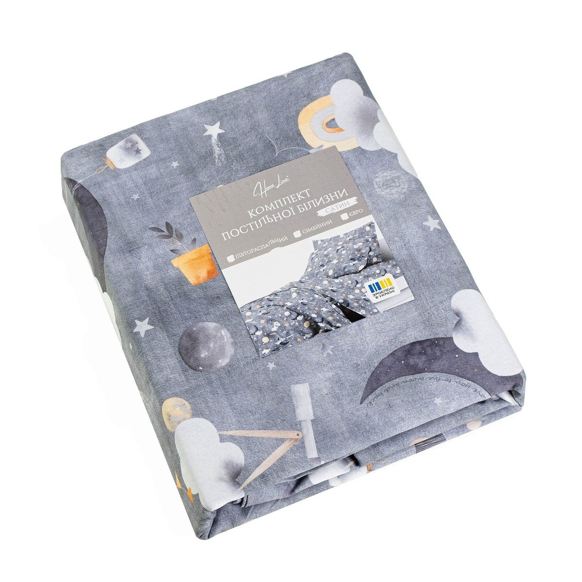 Комплект Home Line Сатин "На добраніч!" выполнен в серых тонах с узором звезд и полумесяца.