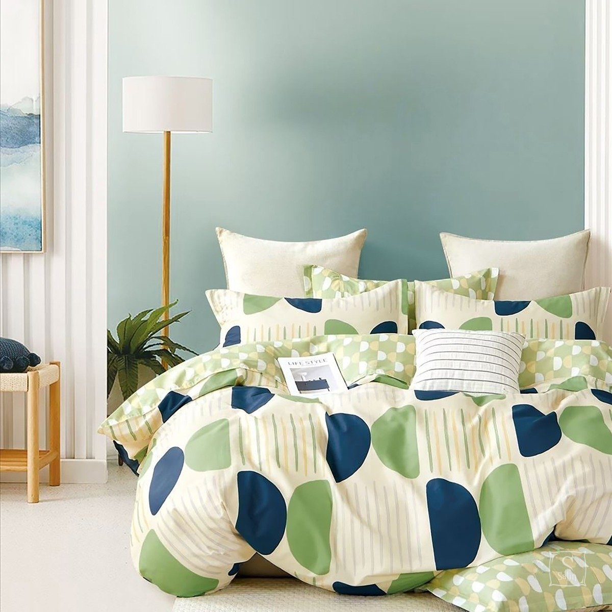 Комплект Home Line Сегмент выполнен с разноцветным сине-зеленым рисунком в стиле фьюжн, ткань 100% хлопок (сатин). Коллекция из сатина высочайшего качества  для самых требовательных потребителей.