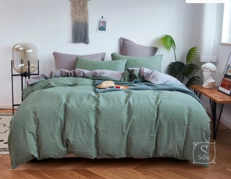 Постельное белье Love you. Вареный хлопок серо-зеленое