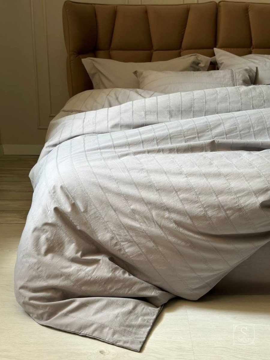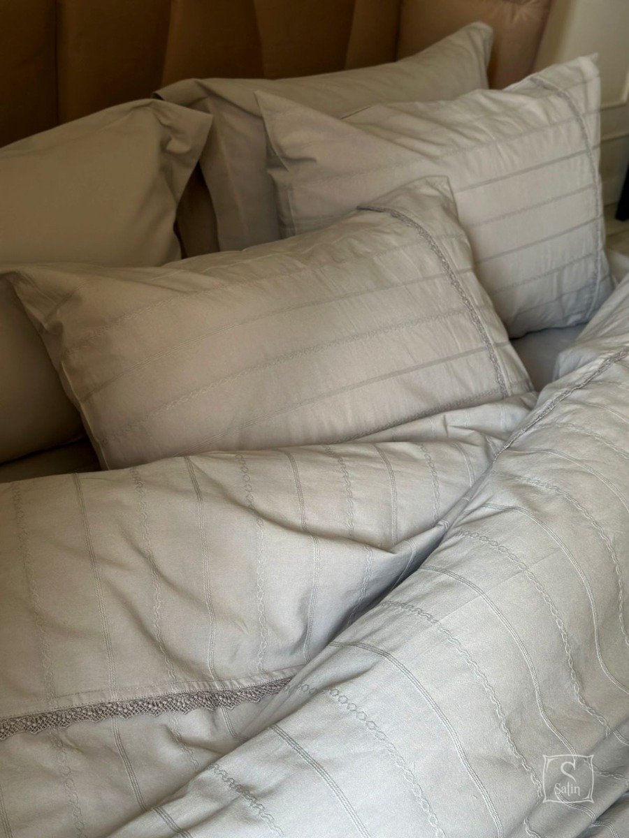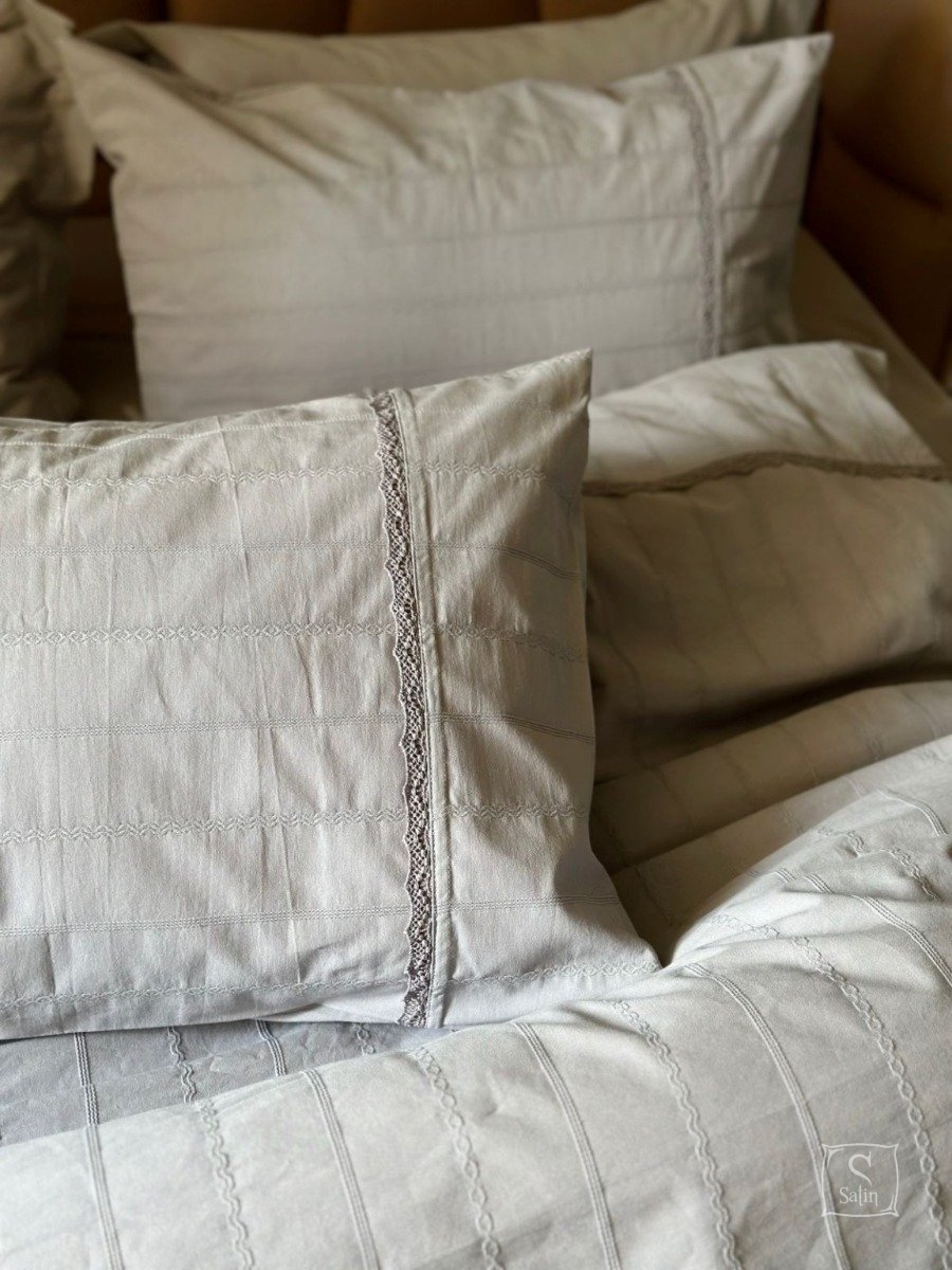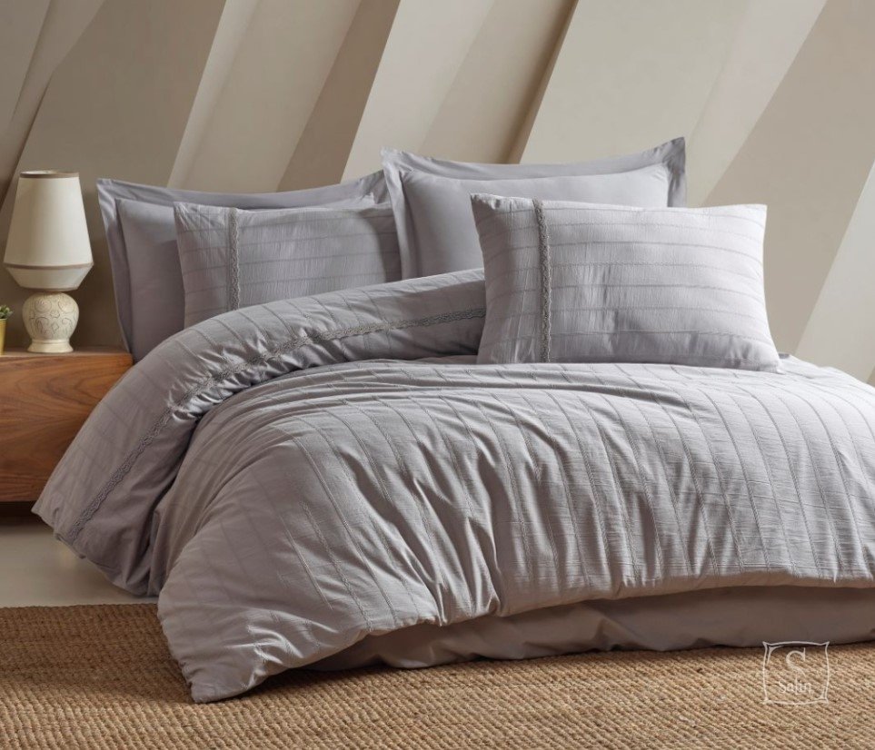 Комплект постельного белья Saheser Eco Cotton Jasmin gri jacquard изготовлен из 100% натурального хлопка, декорирован жаккардовым плетением с ободком из кружева на пододеяльнике и двух наволочках, в сером цвете.