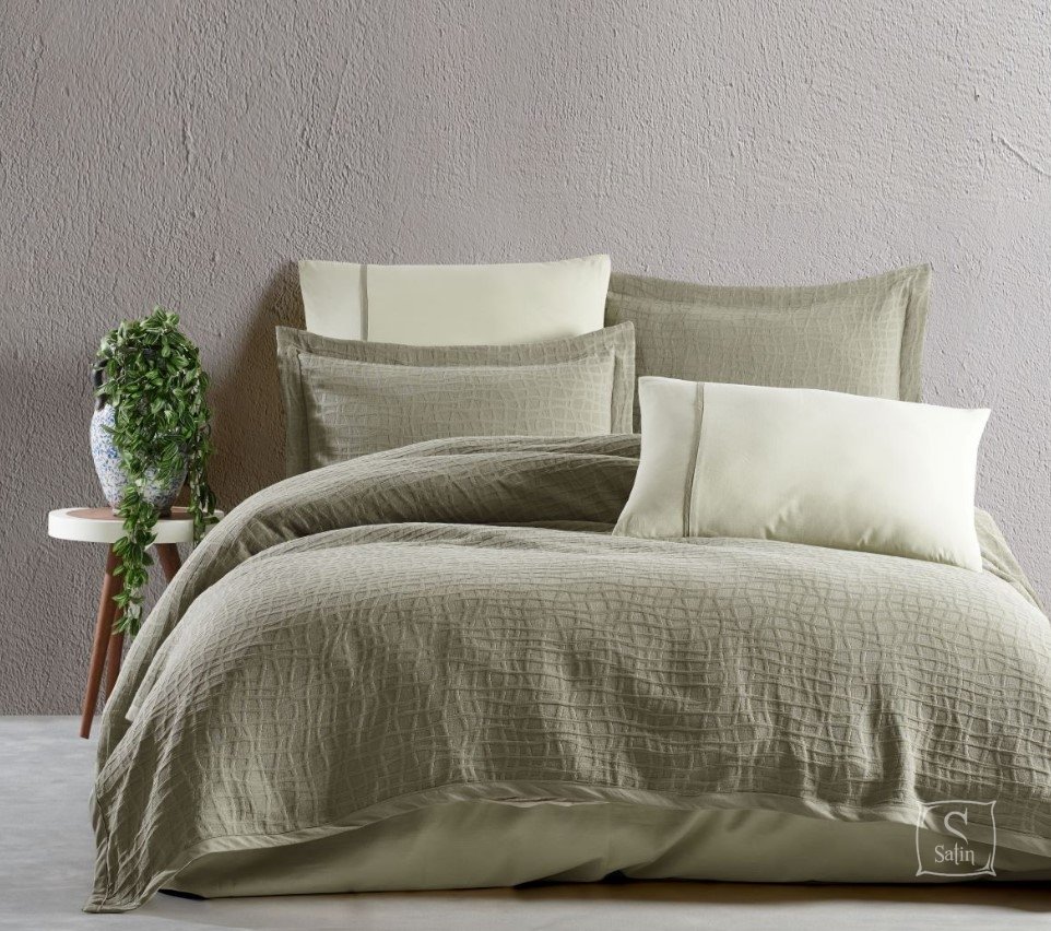 Комплект летнего постельного белья с покрывалом Saheser Tarte yesil изготовлен из 100% натурального хлопка, декорирован жаккардовым узором на покрывале и двух наволочках, в зеленом цвете, однотонное постельное белье светлое с полоской зеленого цвета.