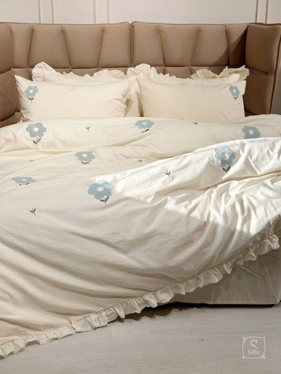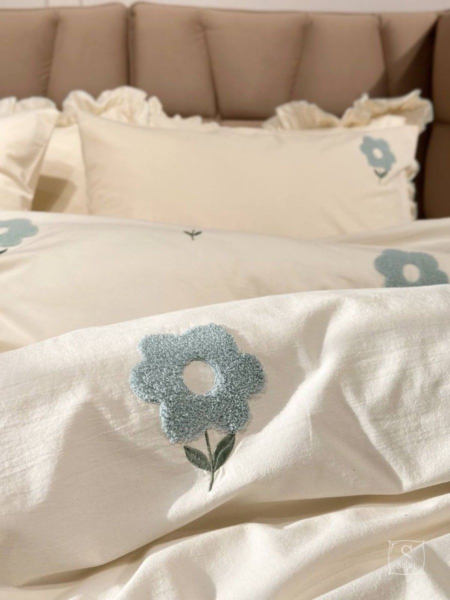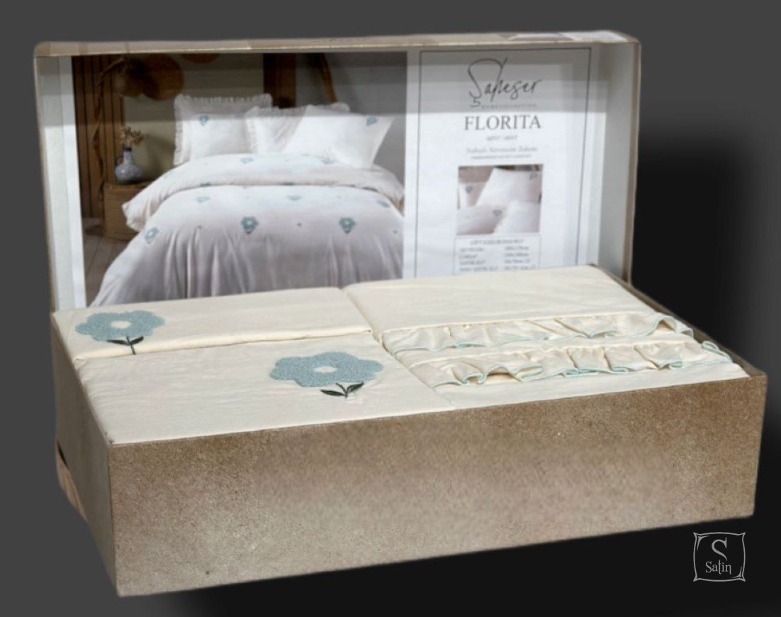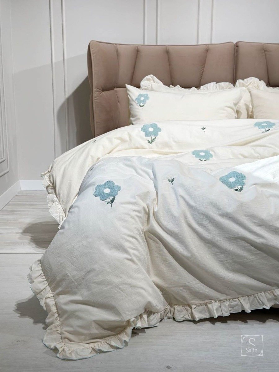 Комплект постельного белья Saheser Florita mint изготовлен из 100% натурального хлопка в молочно-ментоловоых тонах, декорирован вышивкой цветов и рюшами на пододеяльнике и наволочках.