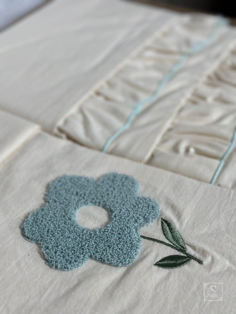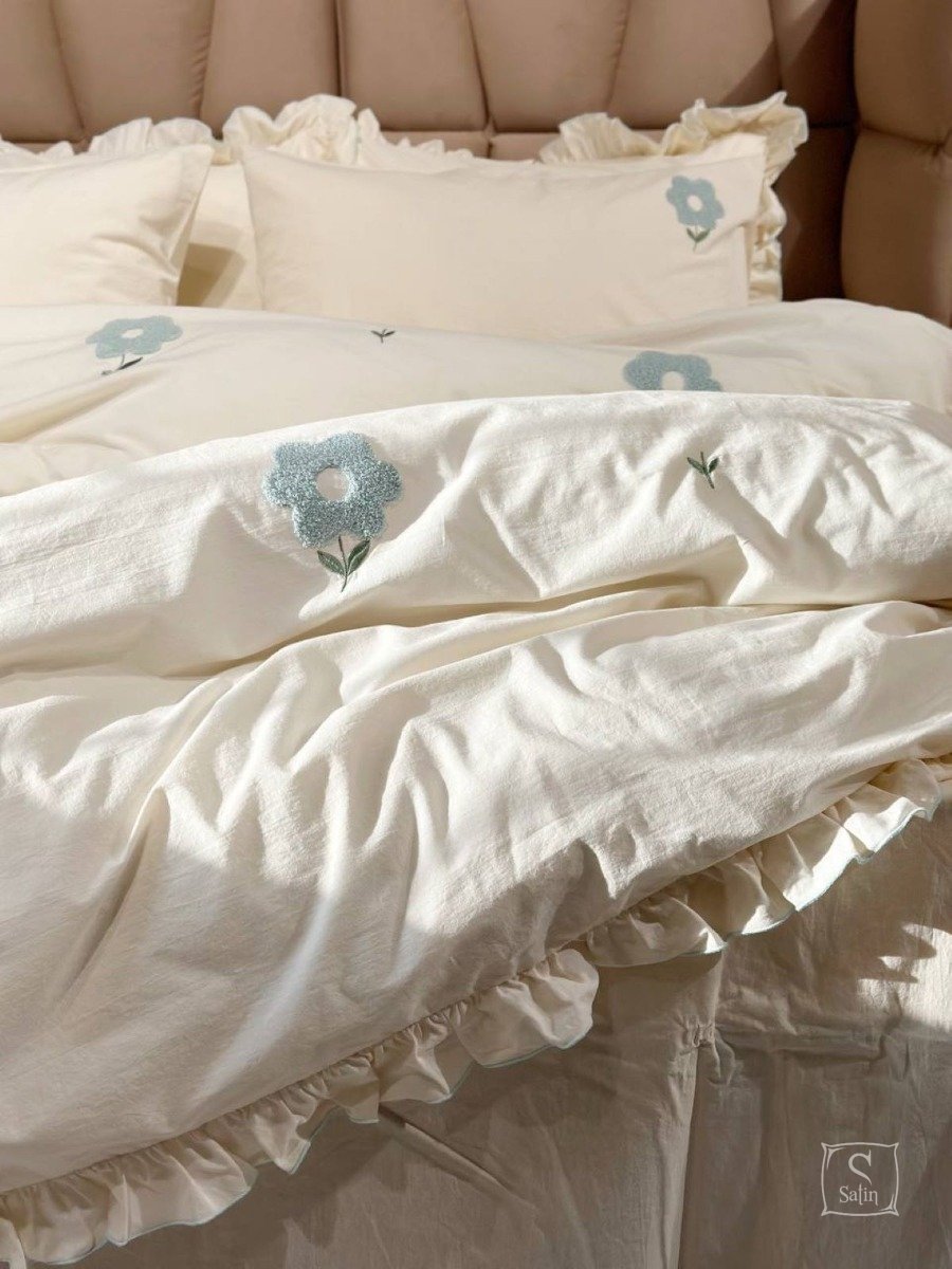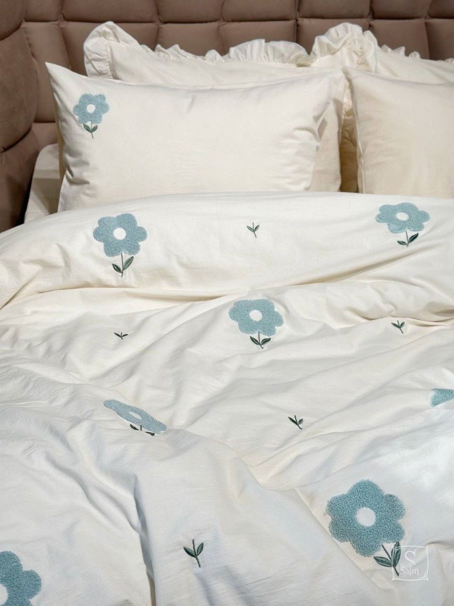 Комплект постельного белья Saheser Florita mint изготовлен из 100% натурального хлопка в молочно-ментоловоых тонах, декорирован вышивкой цветов и рюшами на пододеяльнике и наволочках.