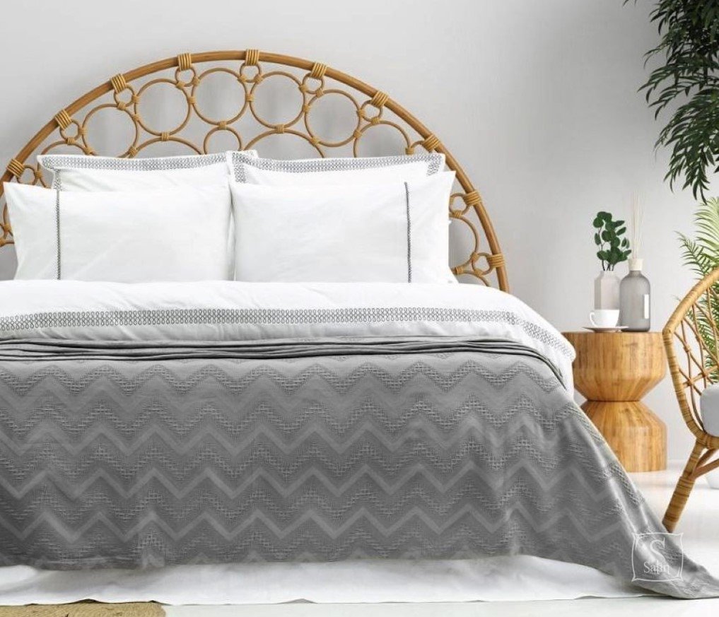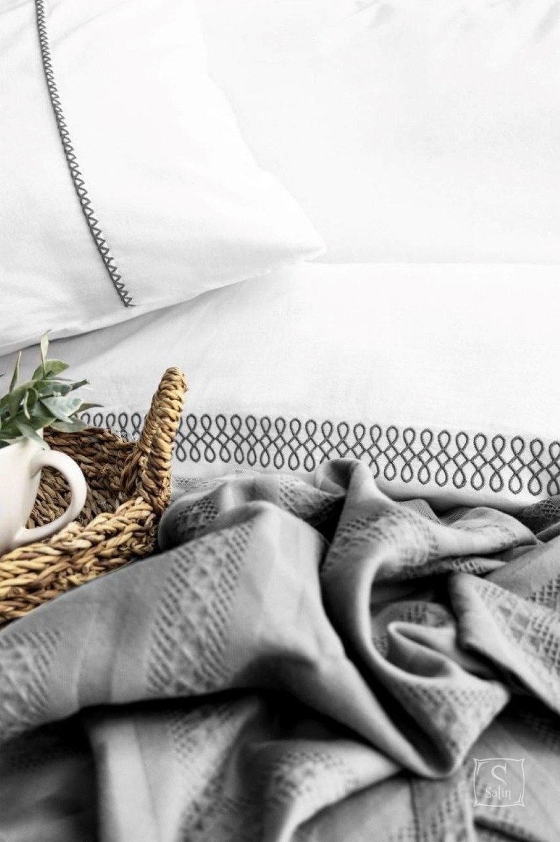 Комплект постельного белья с легким пике Saheser Noemi grey изготовлен из 100% натурального хлопка, однотонный белого цвета, декорированный узором, пике серого цвета с узором.